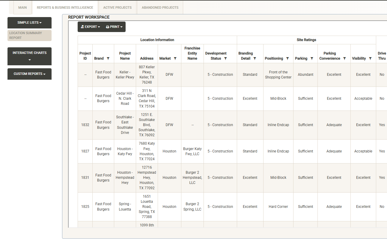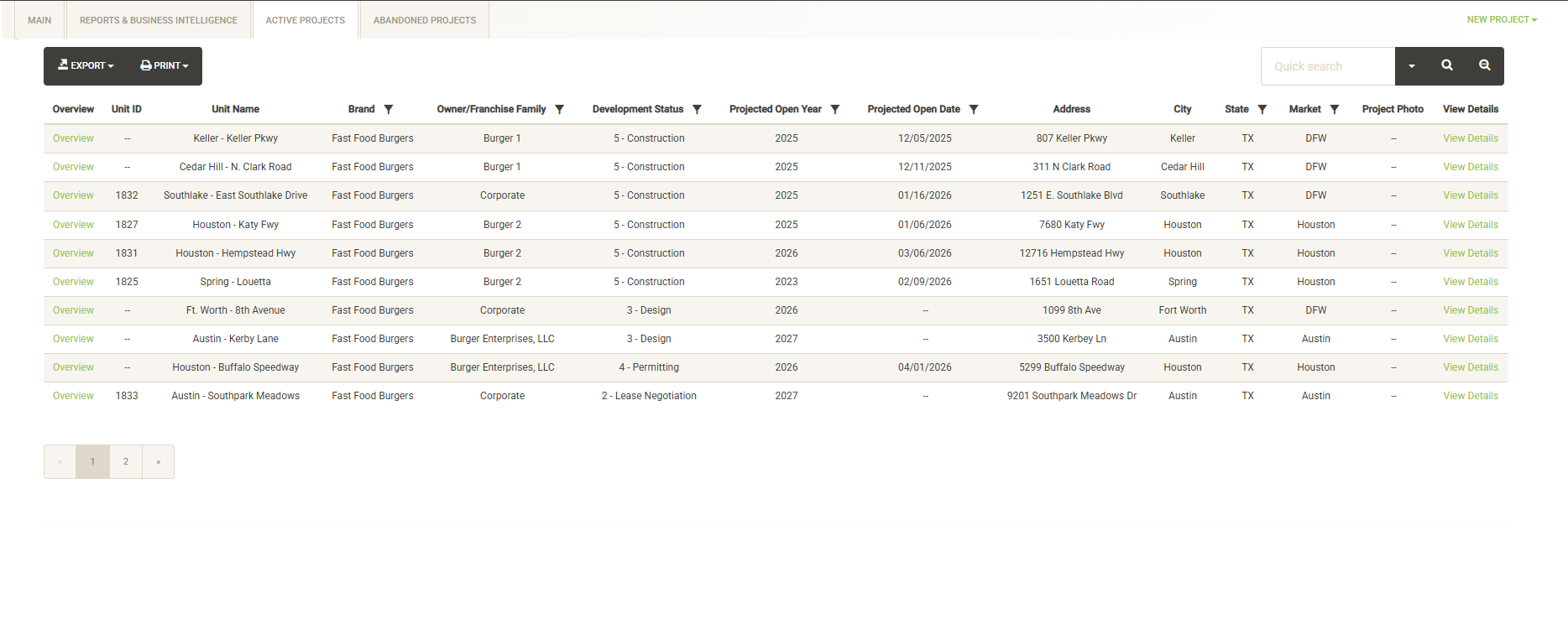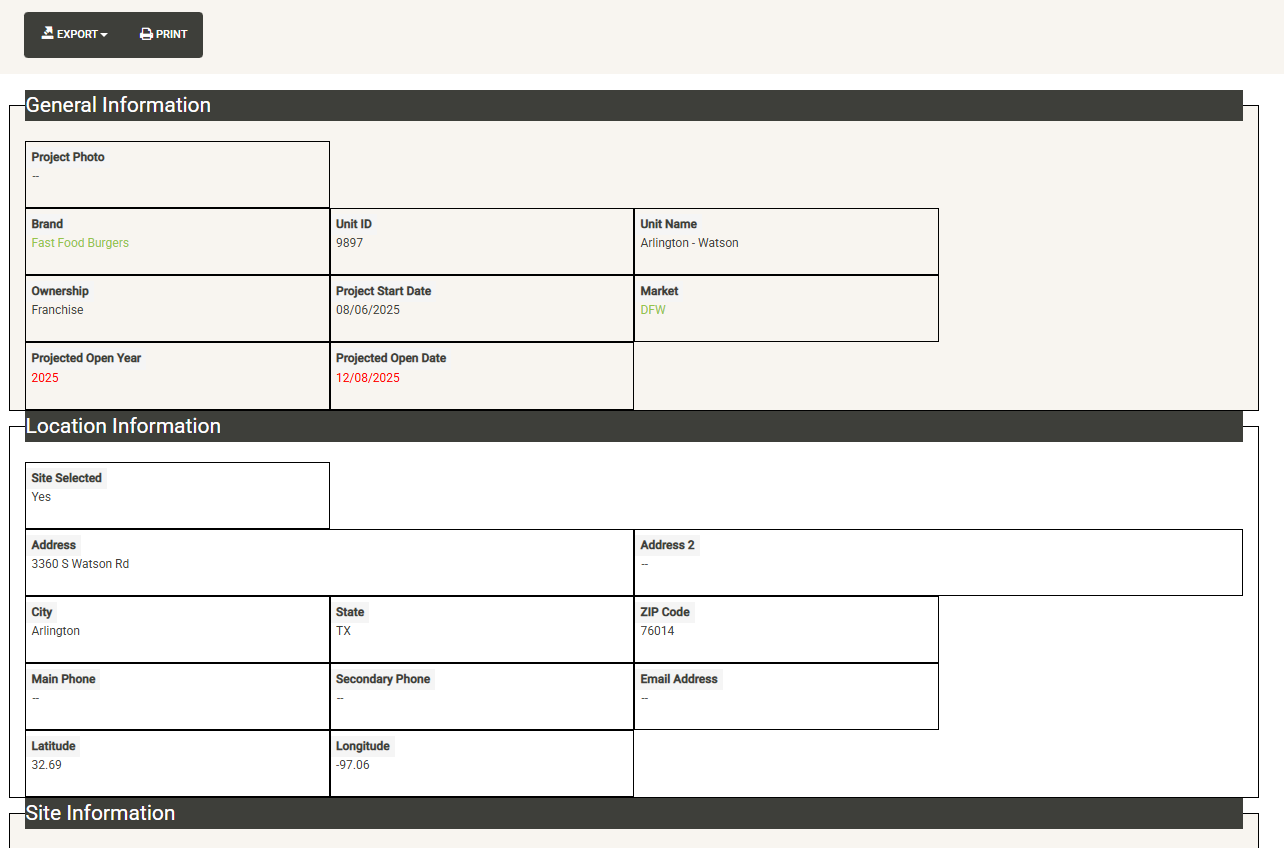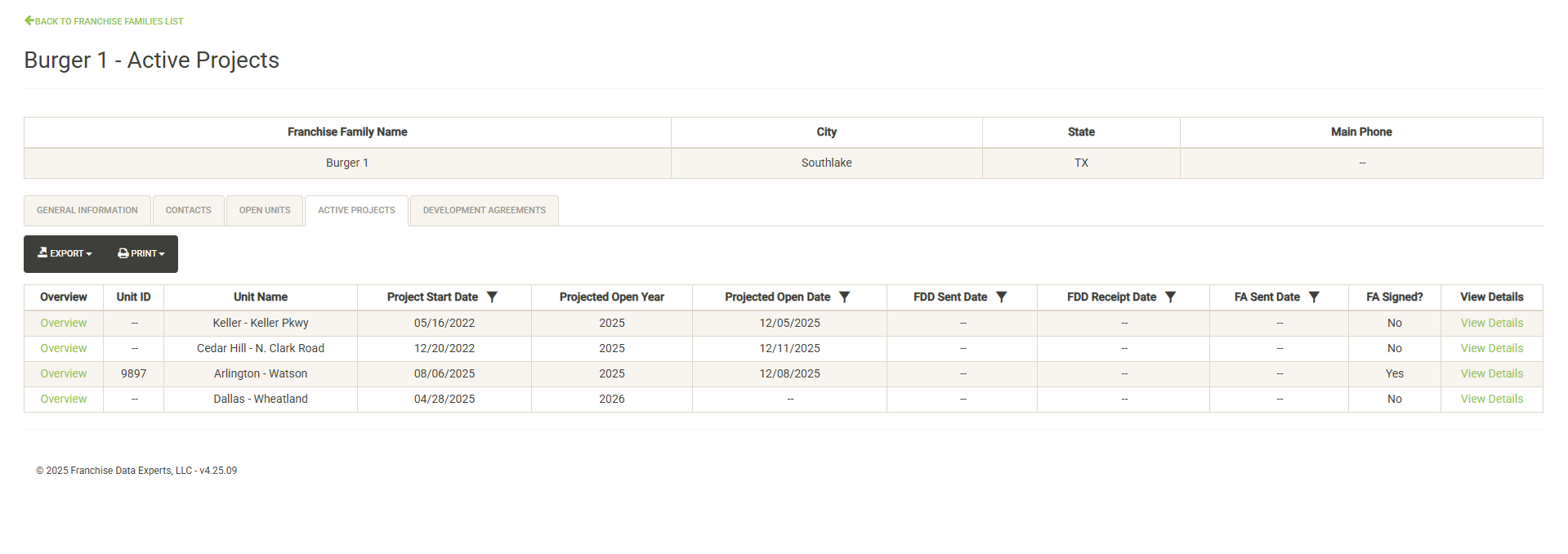 Displays a list of the active projects that are associated with the selected Franchise Family. Also displayed are various attributes of the Franchise Agreement (if an agreement has been signed). You can sort and filter on these columns to customize the list, which can also be exported or printed directly from this screen.
