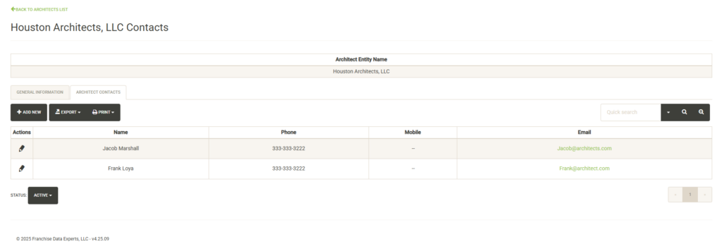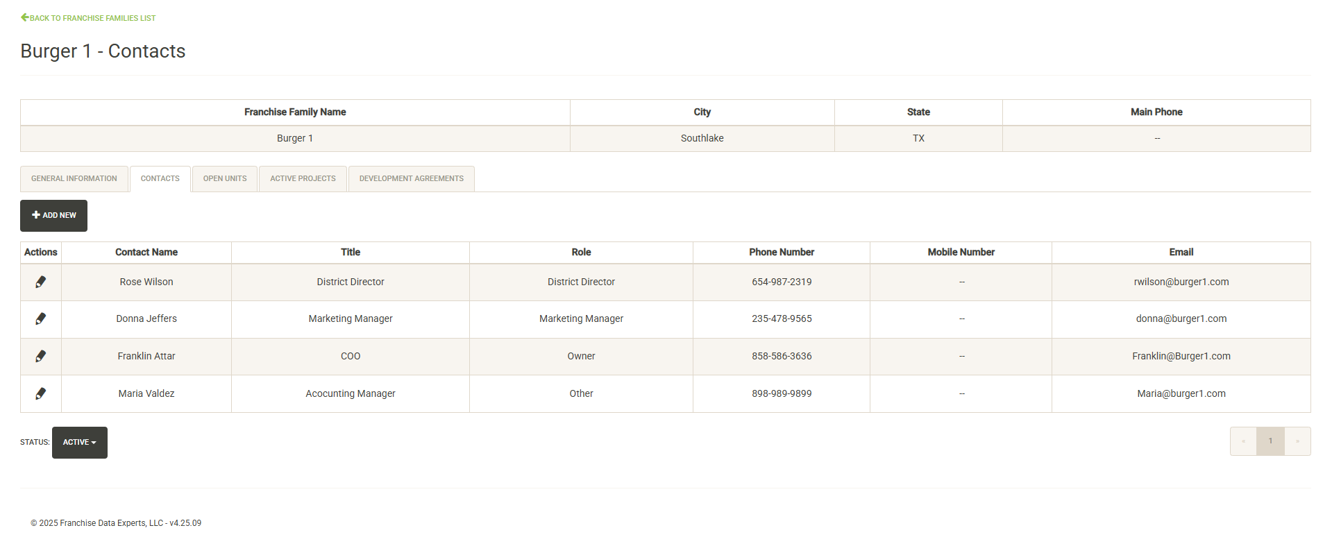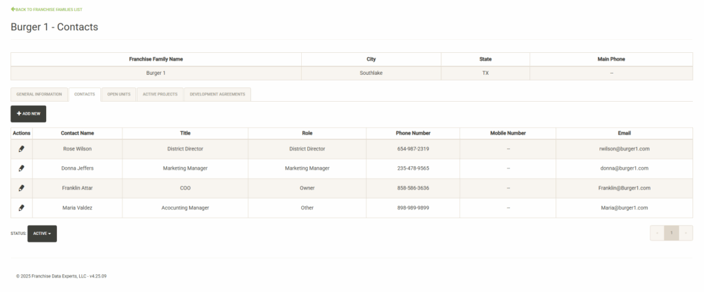 You click on the pencil icon to the left of the contact name to edit the contact information or set it inactive. Click on Add New to add a new contact. Click on the Status dropdown to view active vs. inactive contacts for the Franchise Family.