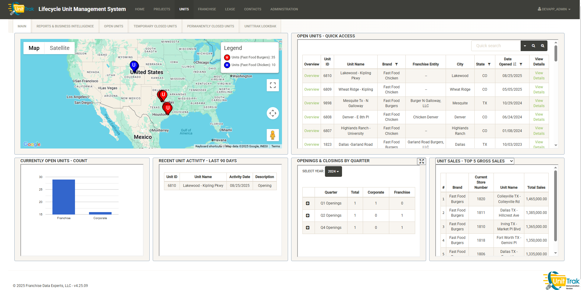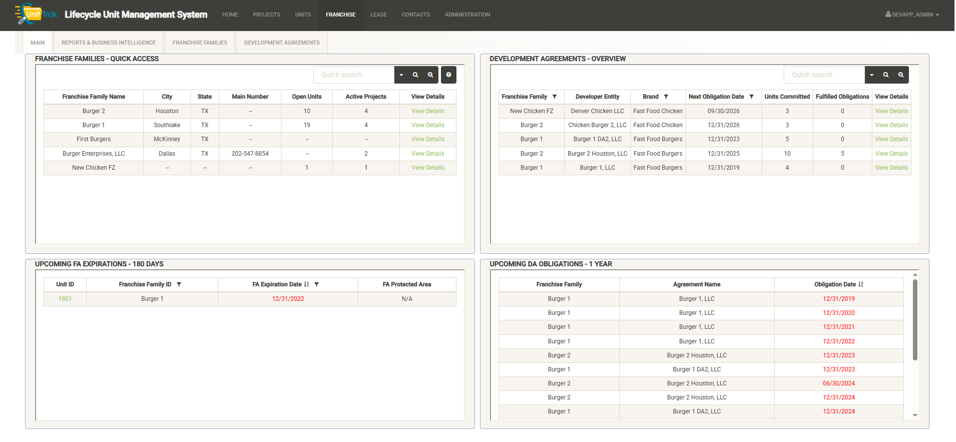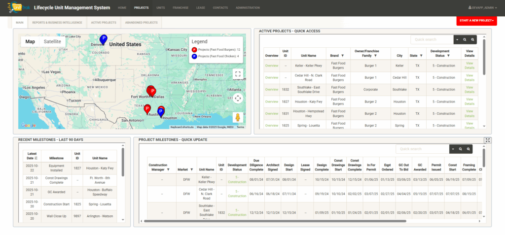 Across the bottom half of the homepage dashboard are a group of widgets to provide quick updates about recent system activity (note-these widgets can but customized by client). Examples here include a log of recent unit activity, a list of recent project milestones, a total unit count by corporate/franchise units, and upcoming Development Agreement obligations. The widgets will quickly alert you to upcoming deadlines, renewals and recent activity.