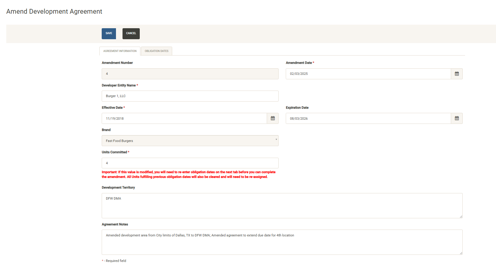 Update the available fields with your new information. Note that if you change the number of units committed, you will have to re-enter all of the obligation dates. If necessary, click over to the Obligation Dates tab before changing this value to record your current obligation dates. If no change is made to the Units Committed field, the obligation dates will not change.