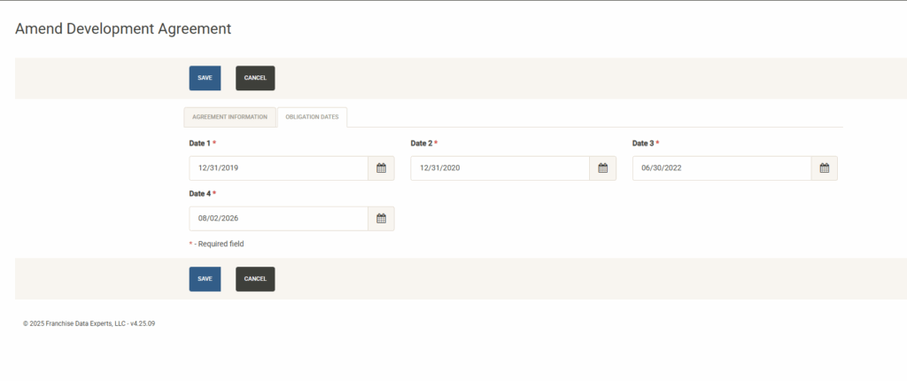 To fulfill development obligations with open units, click on Obligation Dates from the Agreement Information screen.