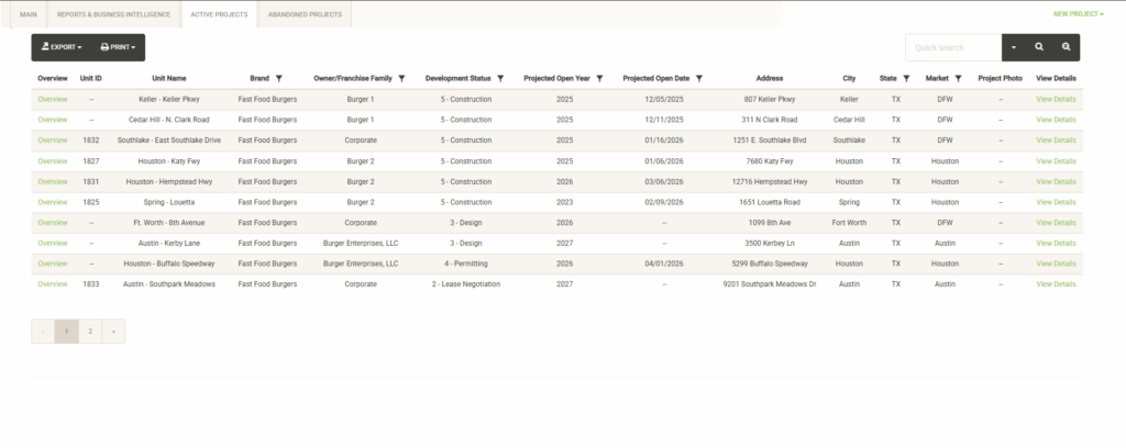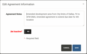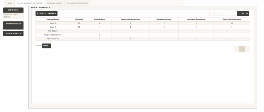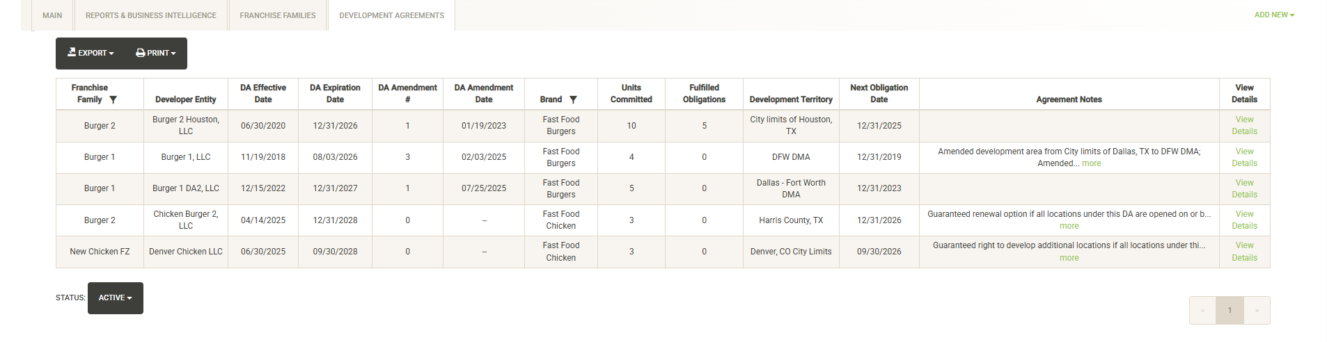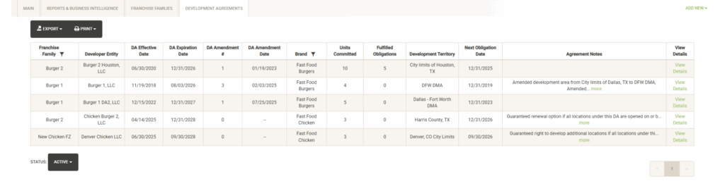 Displays a list of active Development Agreements across all of your Franchise Families. You can sort, filter, export and print this list. Also noted are the units committed and obligations fulfilled and the next obligation date coming up. You can also toggle the Status dropdown to view inactive or fulfilled agreements.