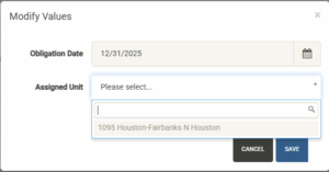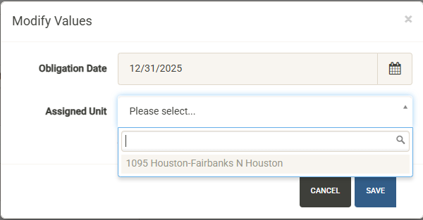 Note that you can only fulfill an obligation with an active, open unit that has been assigned to the Development Agreement. The list will only display units that meet this criteria and have not already been assigned to another obligation date.