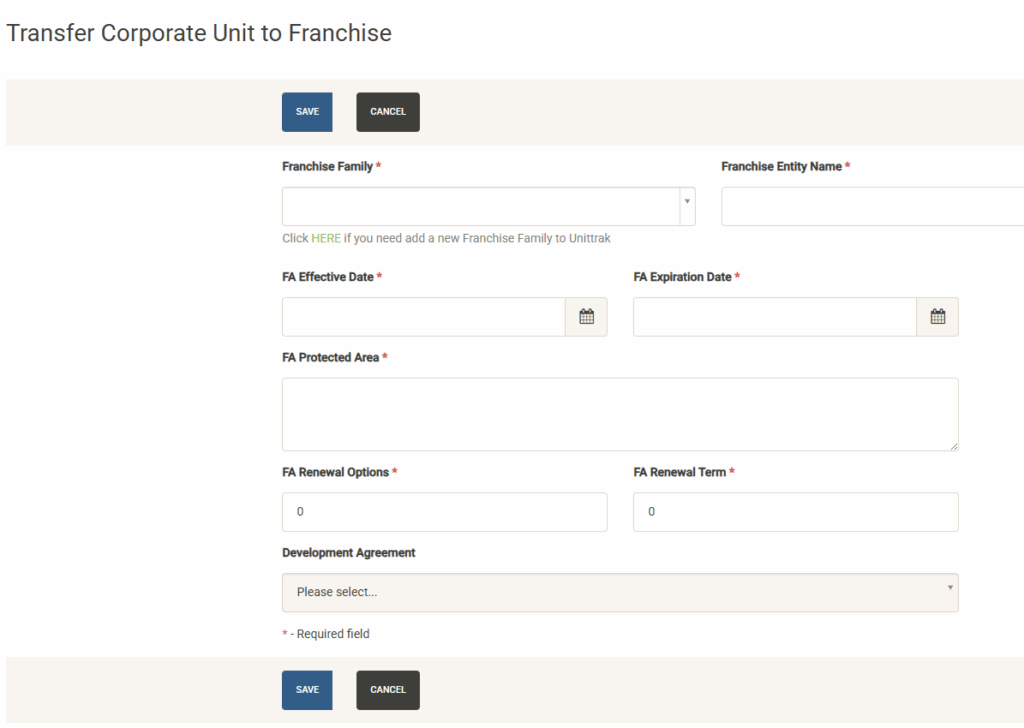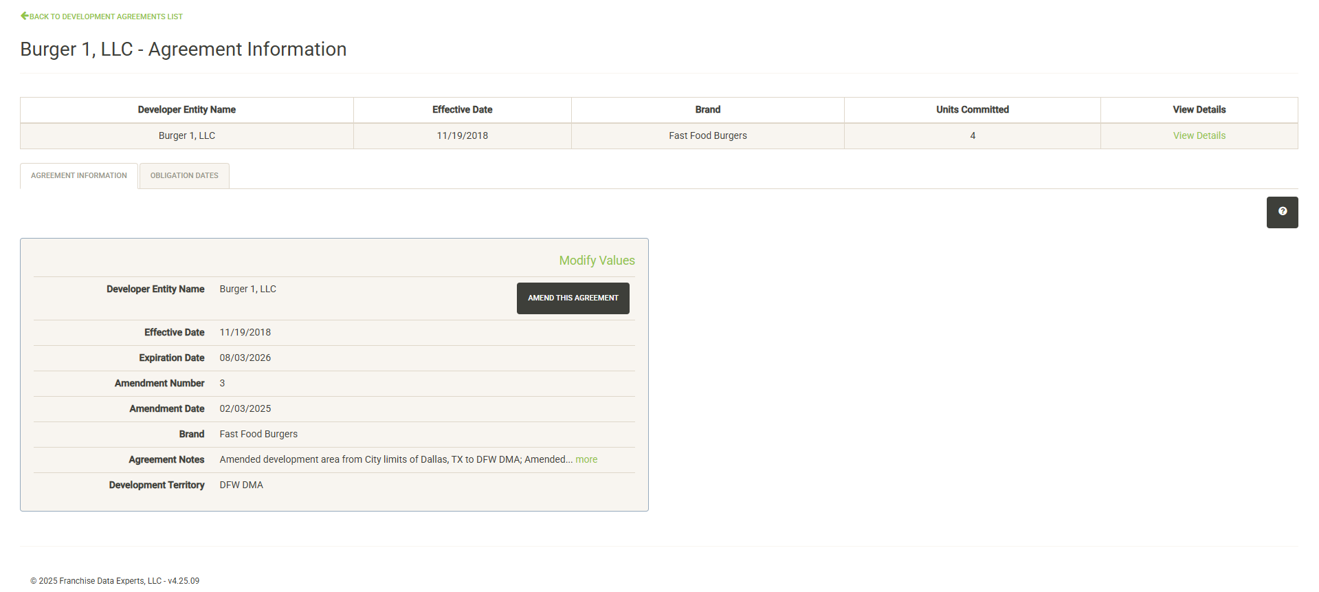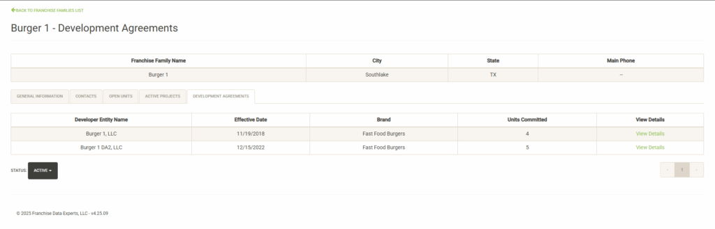 Displays the active Development Agreements for the Franchise Family. Each active agreement includes the effective date and the number of units committed. Click on View Details to see more information or make changes to the agreement. See the Development Agreements section below for more information about viewing or changing an agreement.