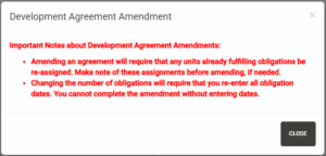 After closing the note, the Amend Development Agreement form is displayed