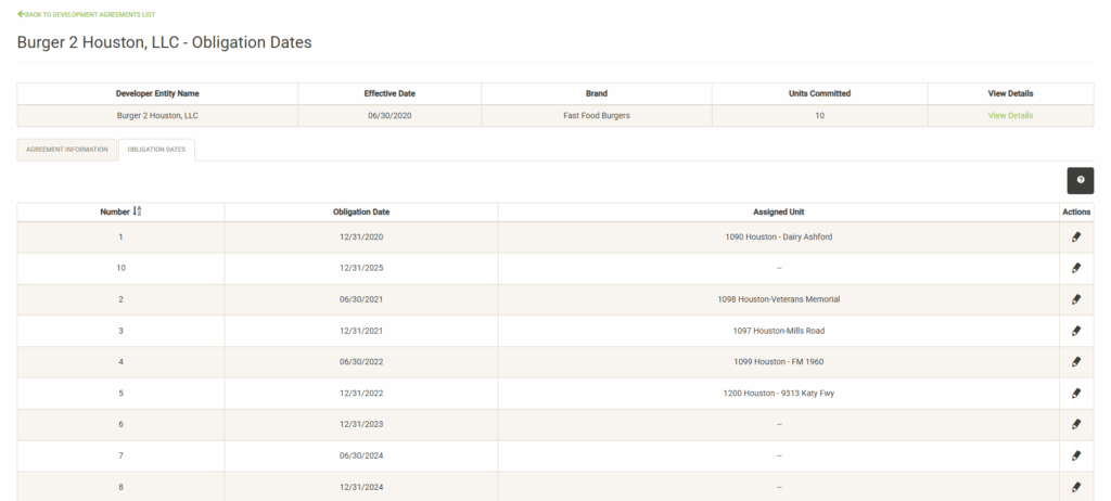 Displays information about the active development agreements in effect for your Franchise Families. The overview page includes information about the agreement including the number of units committed and the number fulfilled. Click on View Details to view/edit the full set of agreement information. See the Development Agreements section for more information.