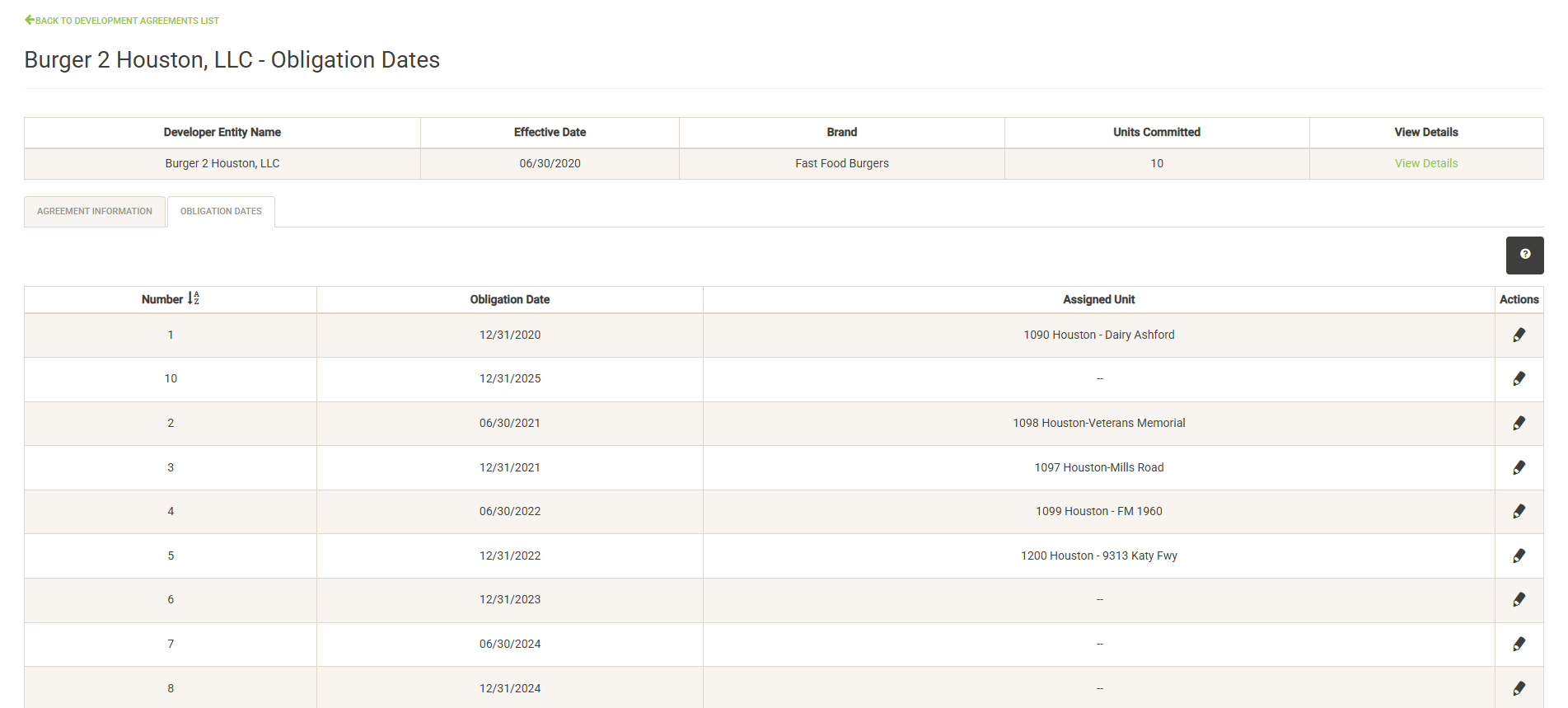 The Obligation Dates tab displays the obligation dates as defined in the agreement, along with units that have been assigned to fulfill those obligations. Click on the edit pencil icon to the right of the obligation date to fulfill the obligation with an active unit.