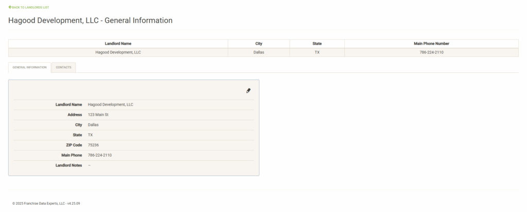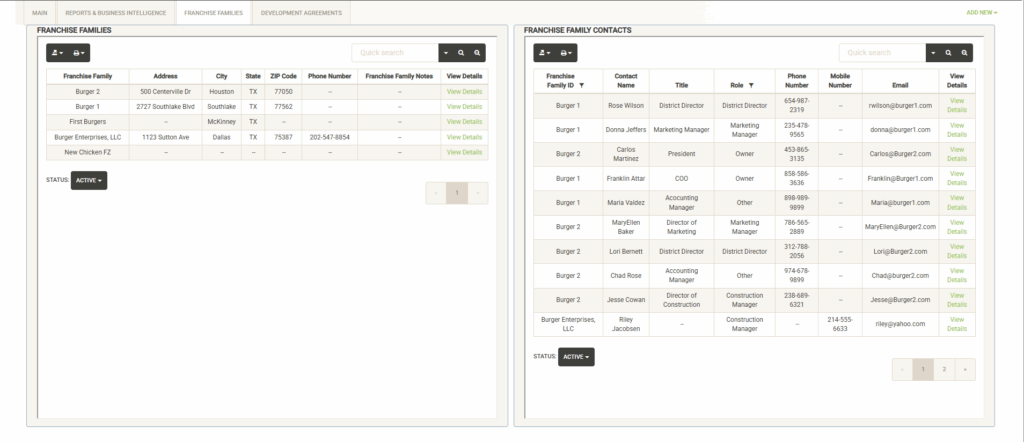 You can search and filter the list of landlords to view information about them. The Quick Access window shows basic information about the Franchise Family including the main phone number. Click on View Details to view/edit the full set of information about the landlord. See the Landlords & Contacts section for more information about this.