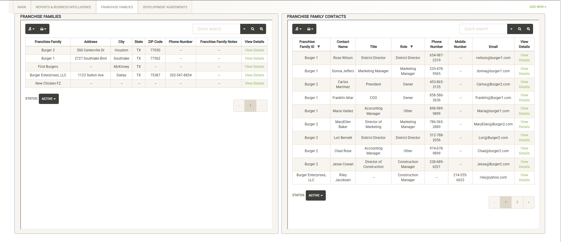 Displays contacts for the selected Franchise Family. You click on the pencil icon to the left of the contact name to edit the contact information or set it inactive. Click on Add New to add a new contact. Click on the Status dropdown to view active vs. inactive contacts for the Franchise Family.