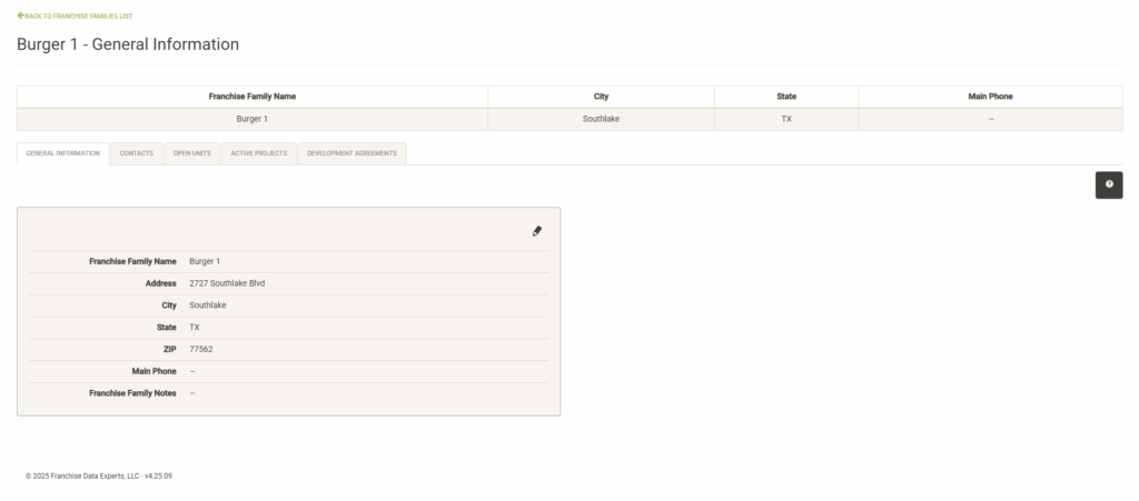 Displays basic information about the Franchise Family including address, phone and notes. Click on the pencil icon to edit values here (with the proper permissions).
