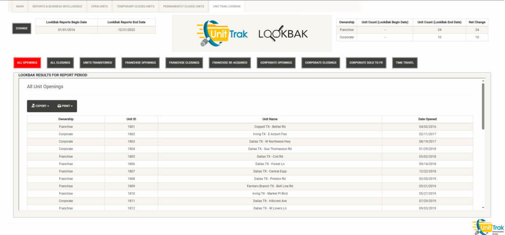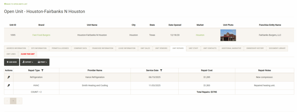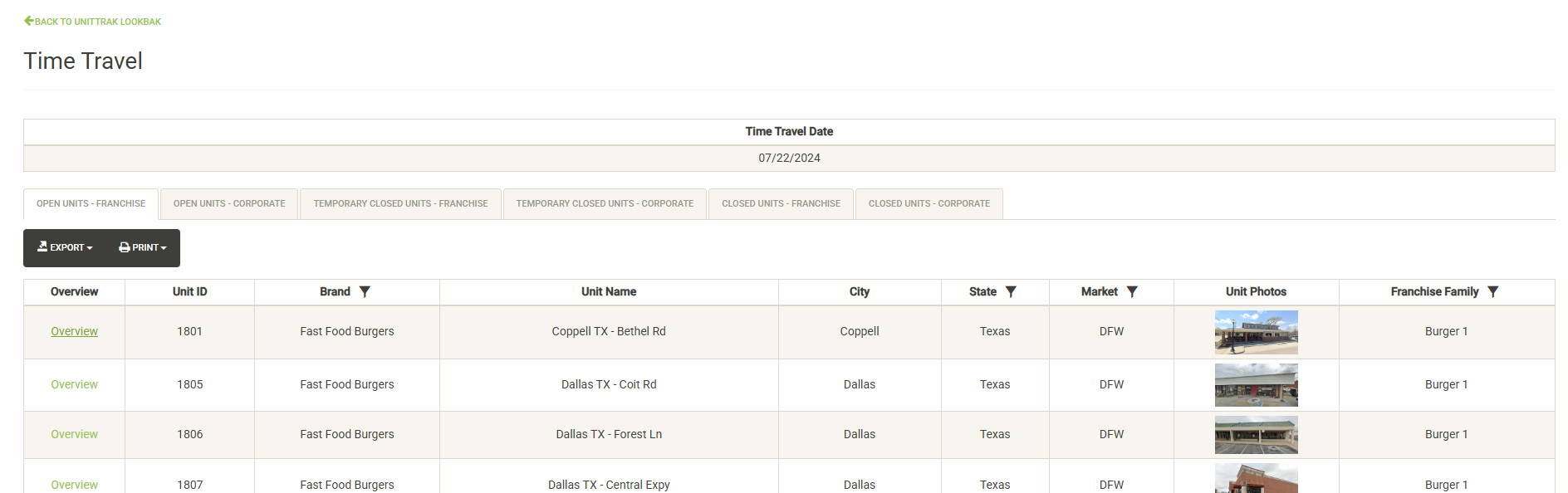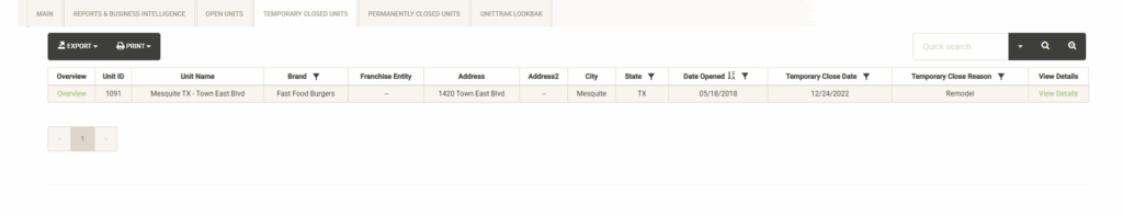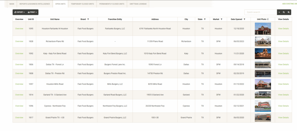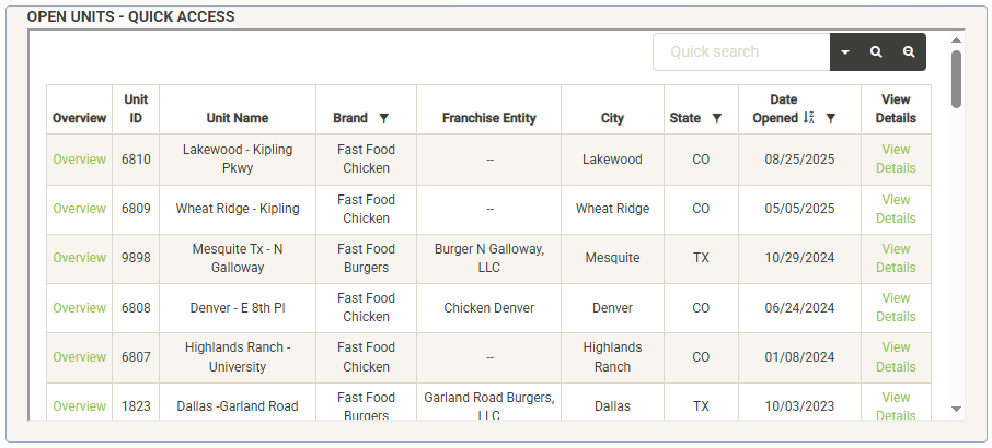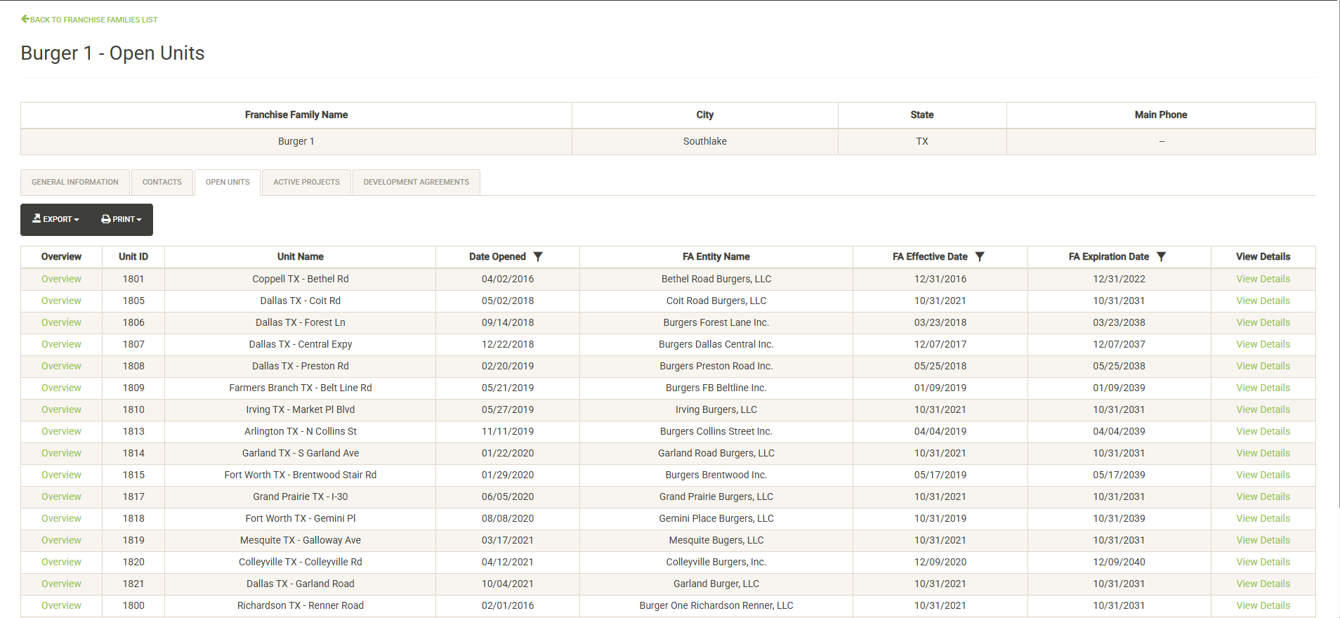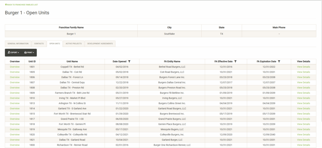 Displays a list of the open units that are associated with the selected Franchise Family. Also displayed are various attributes of the Franchise Agreement. You can sort and filter on these columns to customize the list, which can also be exported or printed directly from this screen.