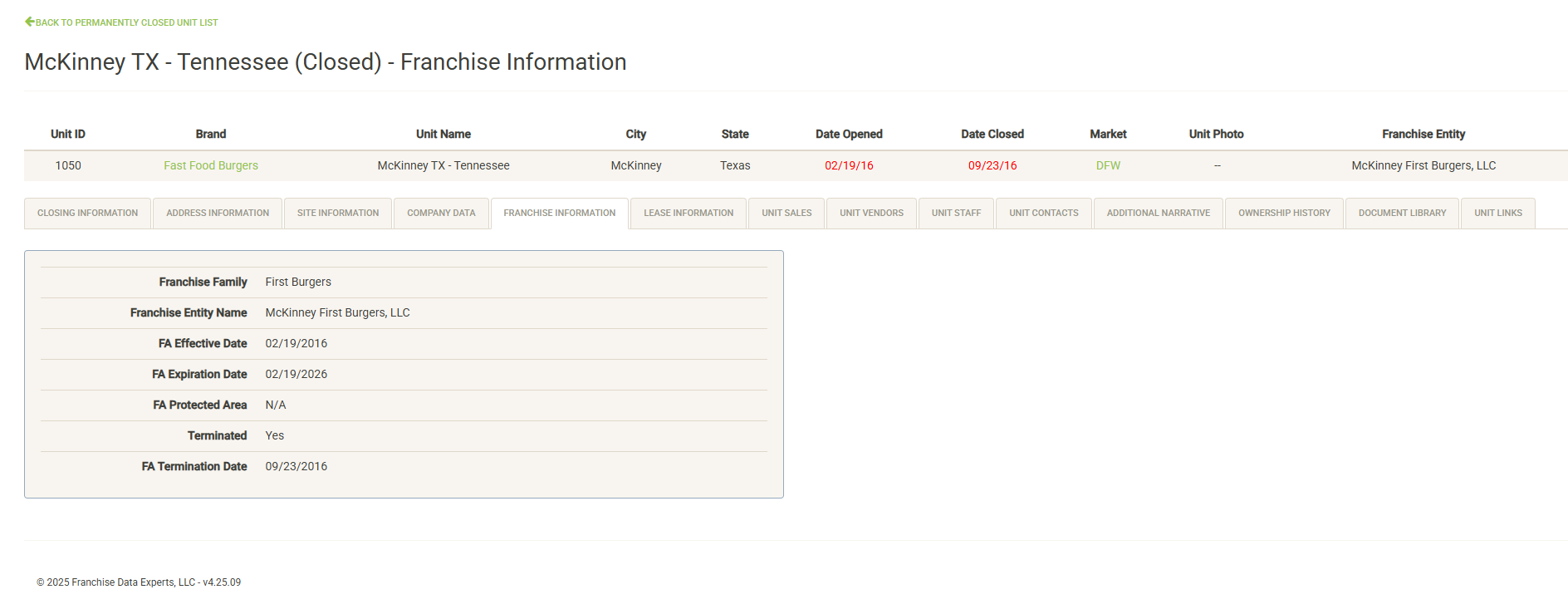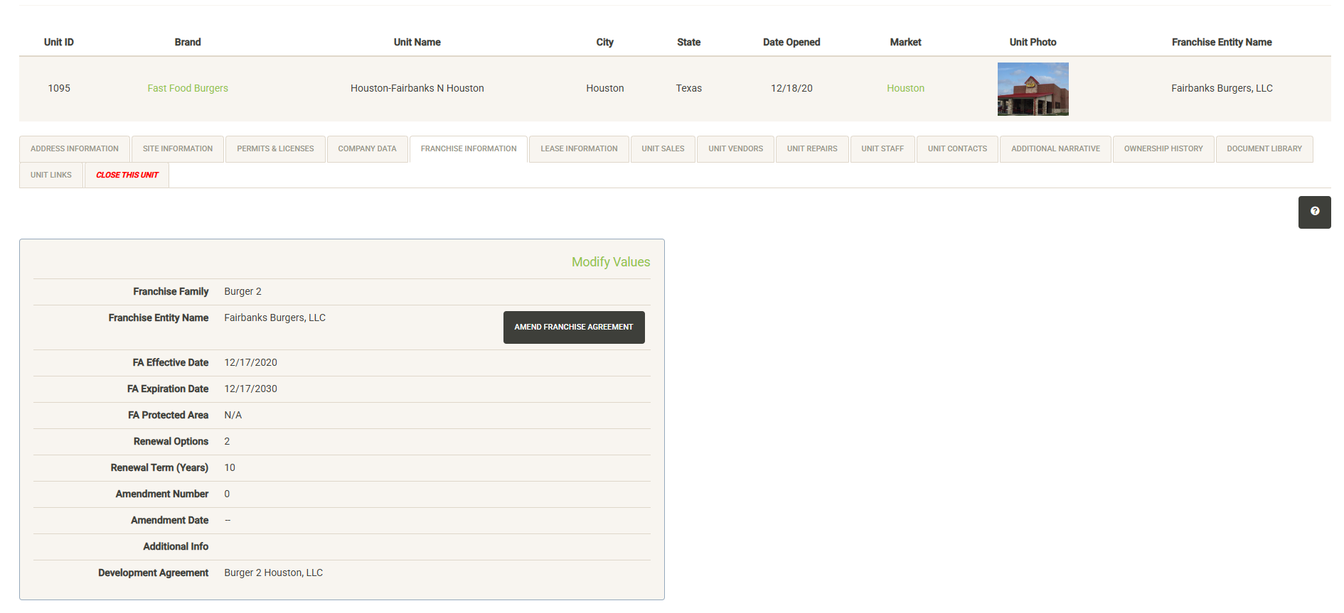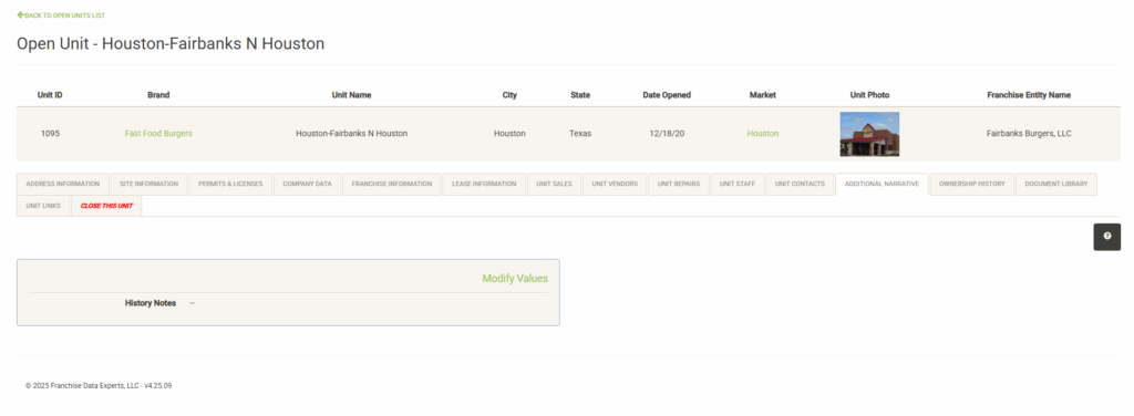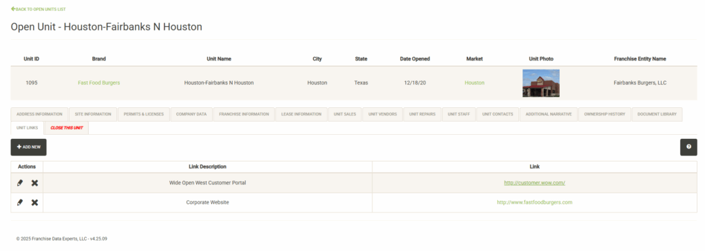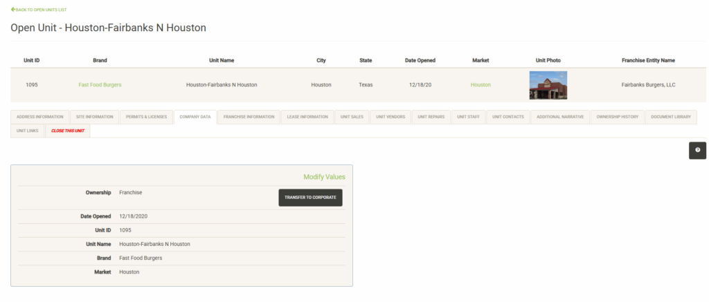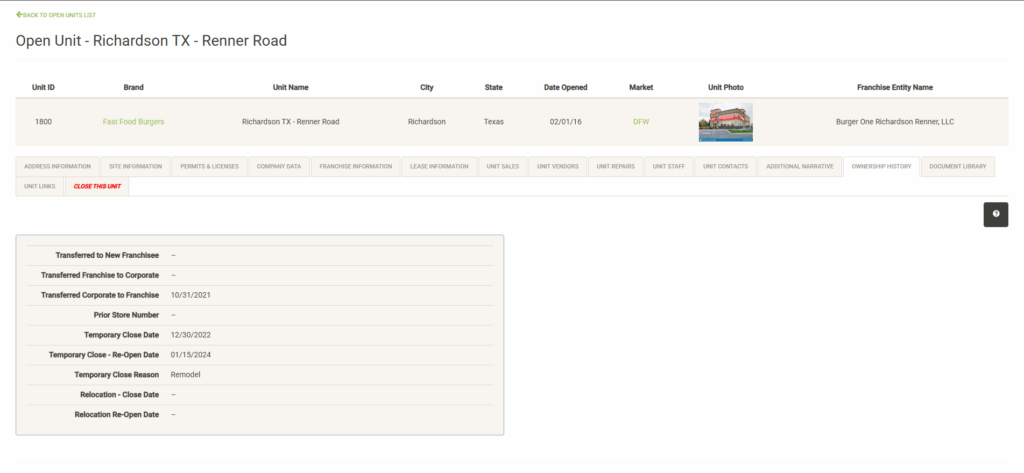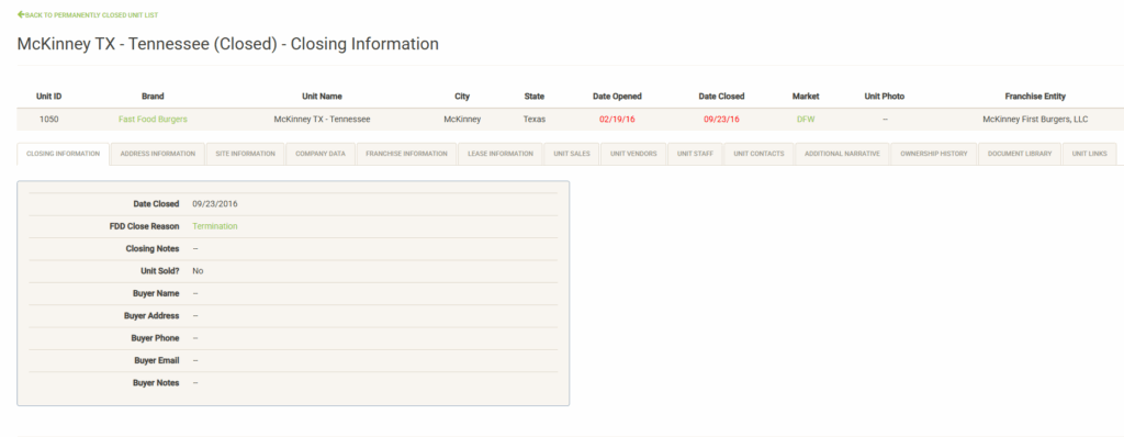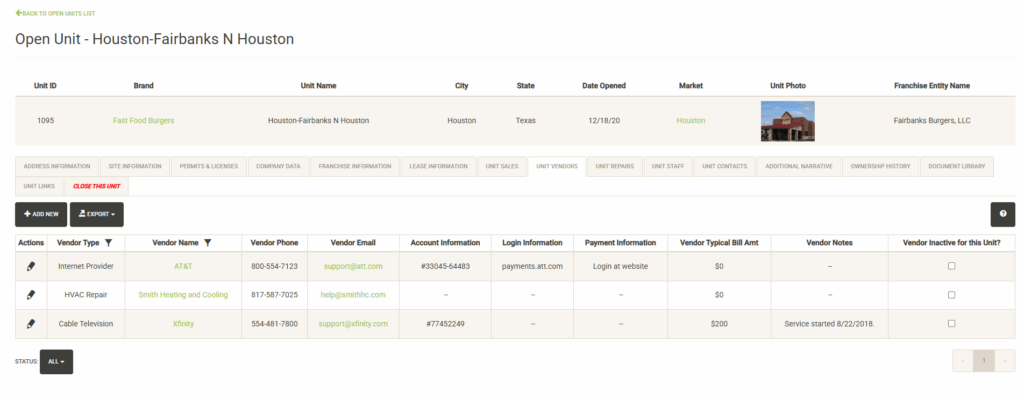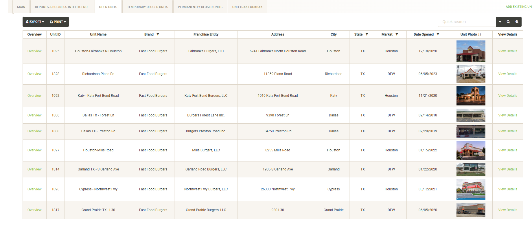 Displays a list of the open units that are associated with the selected Franchise Family. Also displayed are various attributes of the Franchise Agreement. You can sort and filter on these columns to customize the list, which can also be exported or printed directly from this screen.