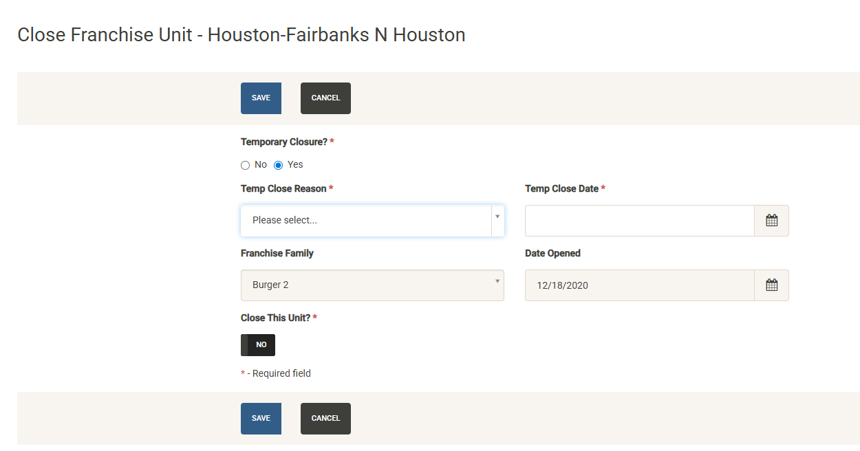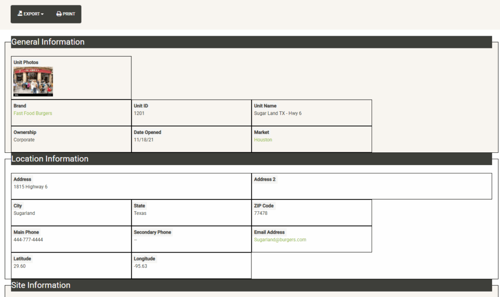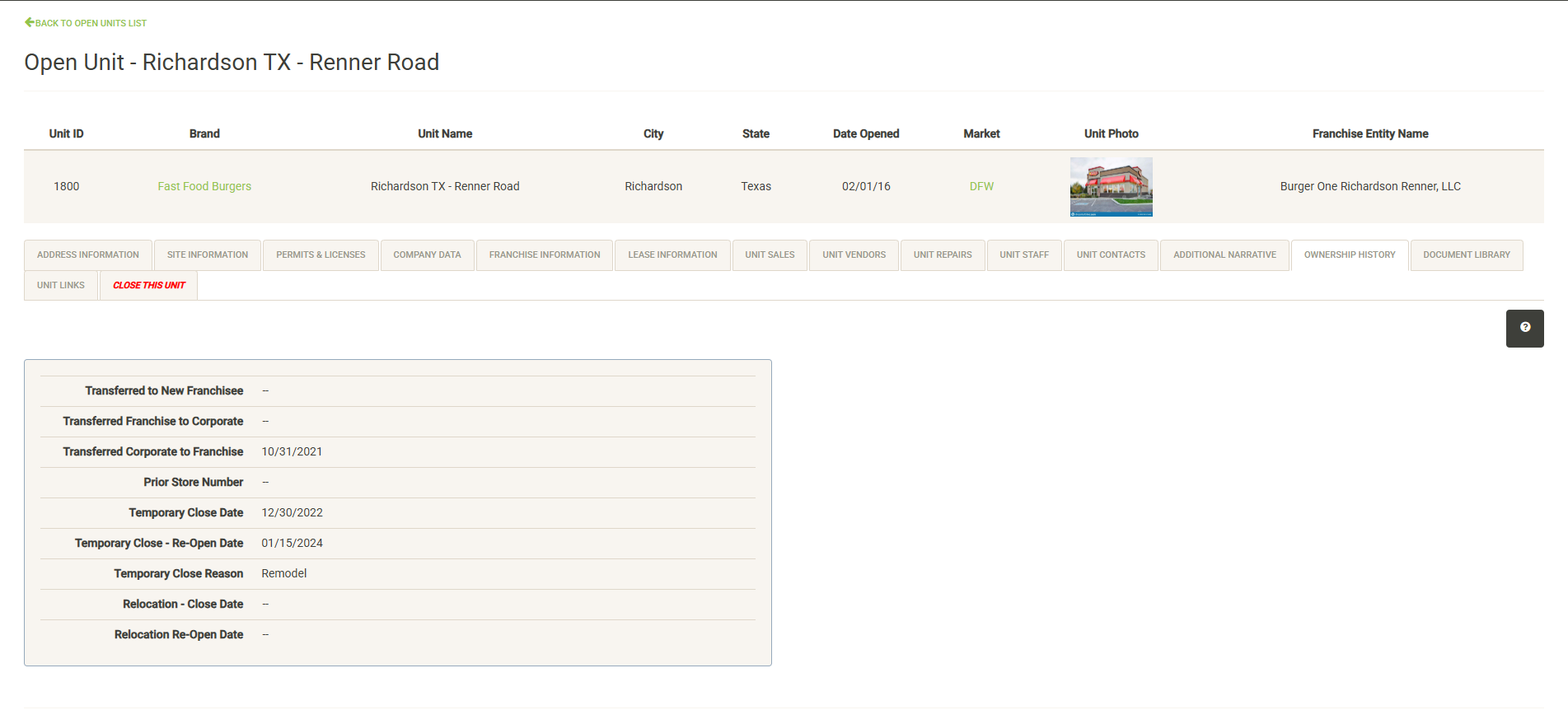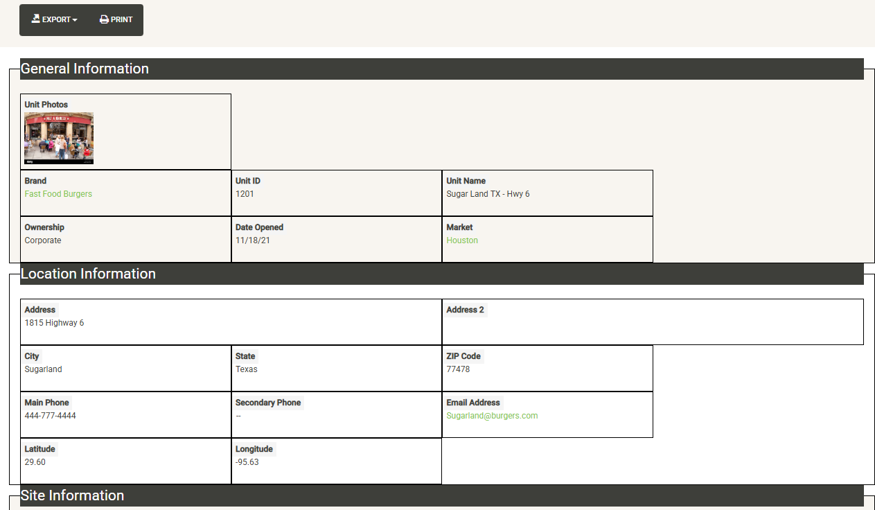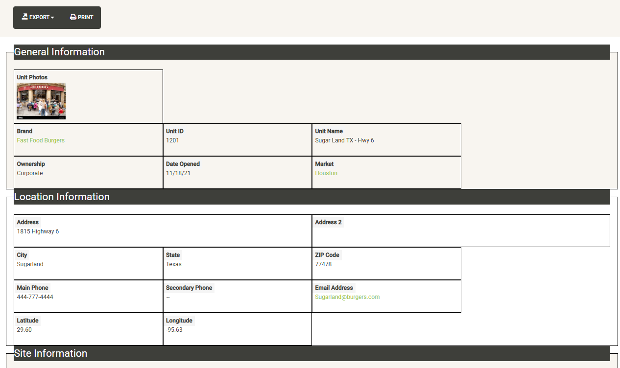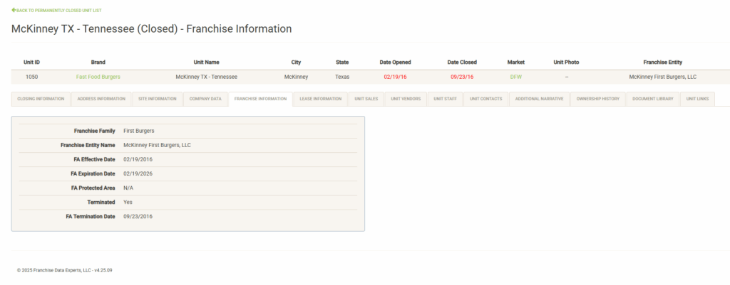 Displays a list of the open units that are associated with the selected Franchise Family. Also displayed are various attributes of the Franchise Agreement. You can sort and filter on these columns to customize the list, which can also be exported or printed directly from this screen.