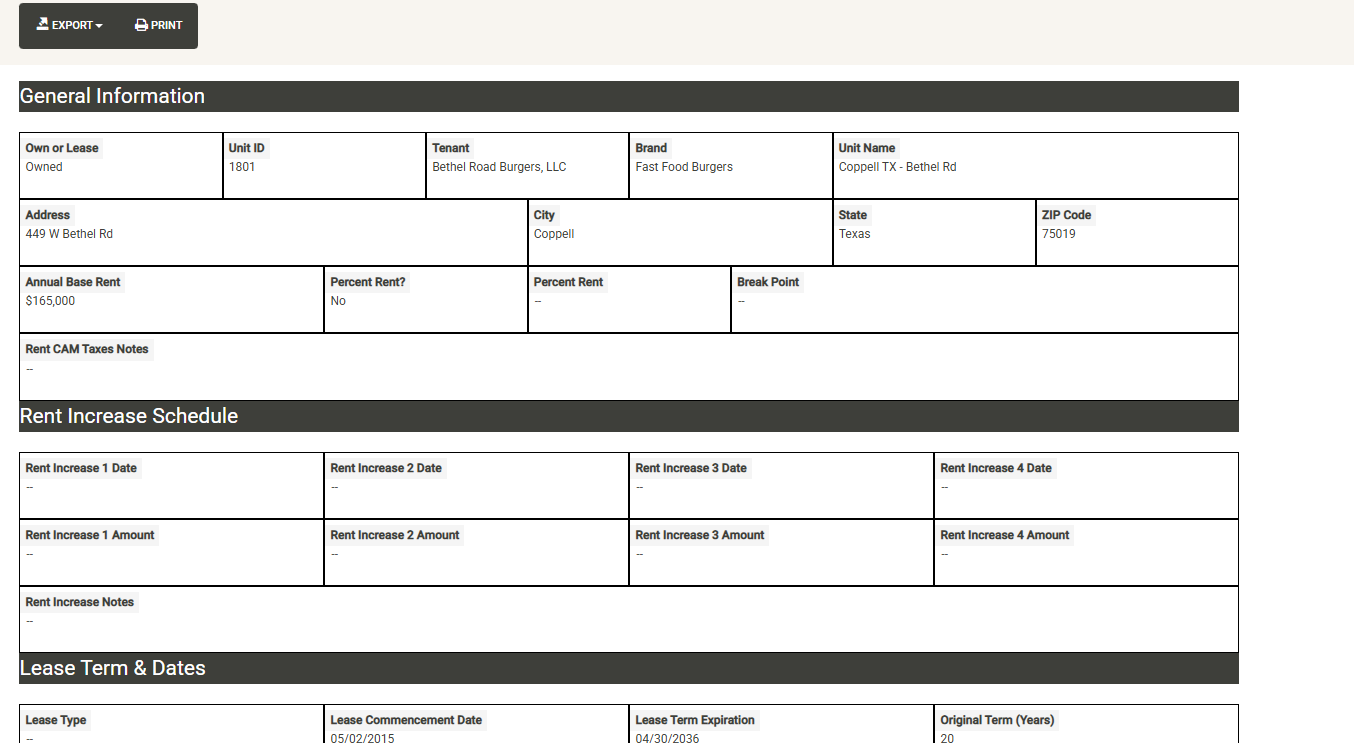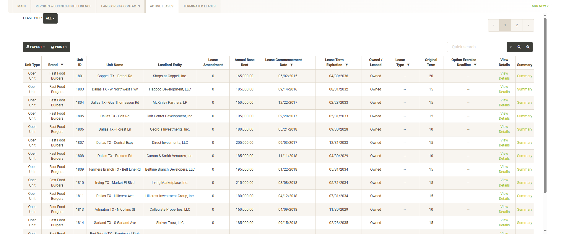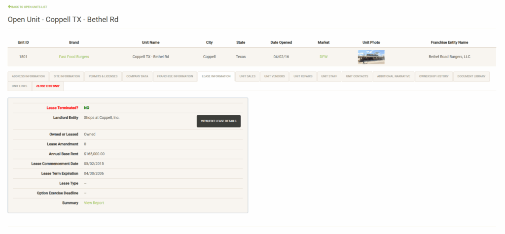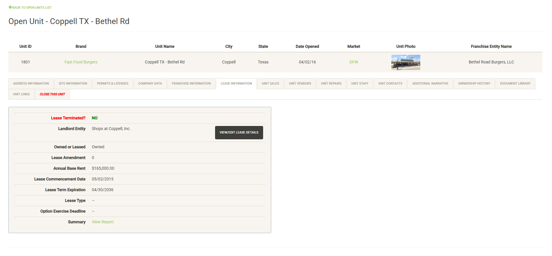 Existing Leases display the View/Edit Lease Details button. Clicking the button will take you to the full lease details page for the lease. The Summary link provides a quick lease overview report that can be printed or exported and shared.