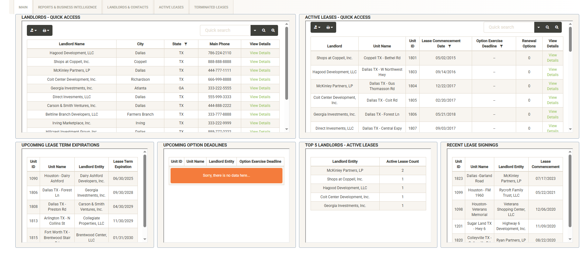 Across the bottom of the Lease Dash page are example alert widgets to keep you up-to-date on lease expiration and renewal dates as well as providing quick summaries of key data. These alert widgets can be customized for your needs.