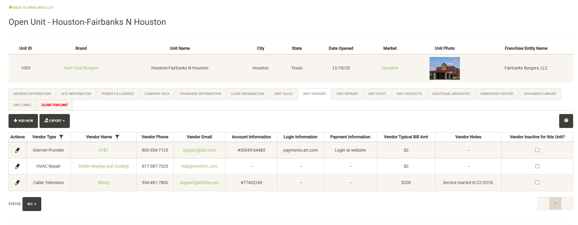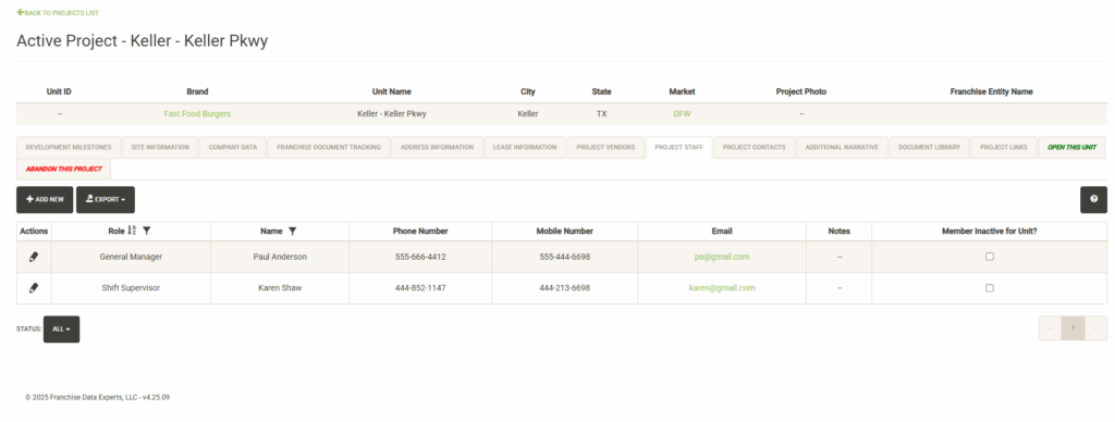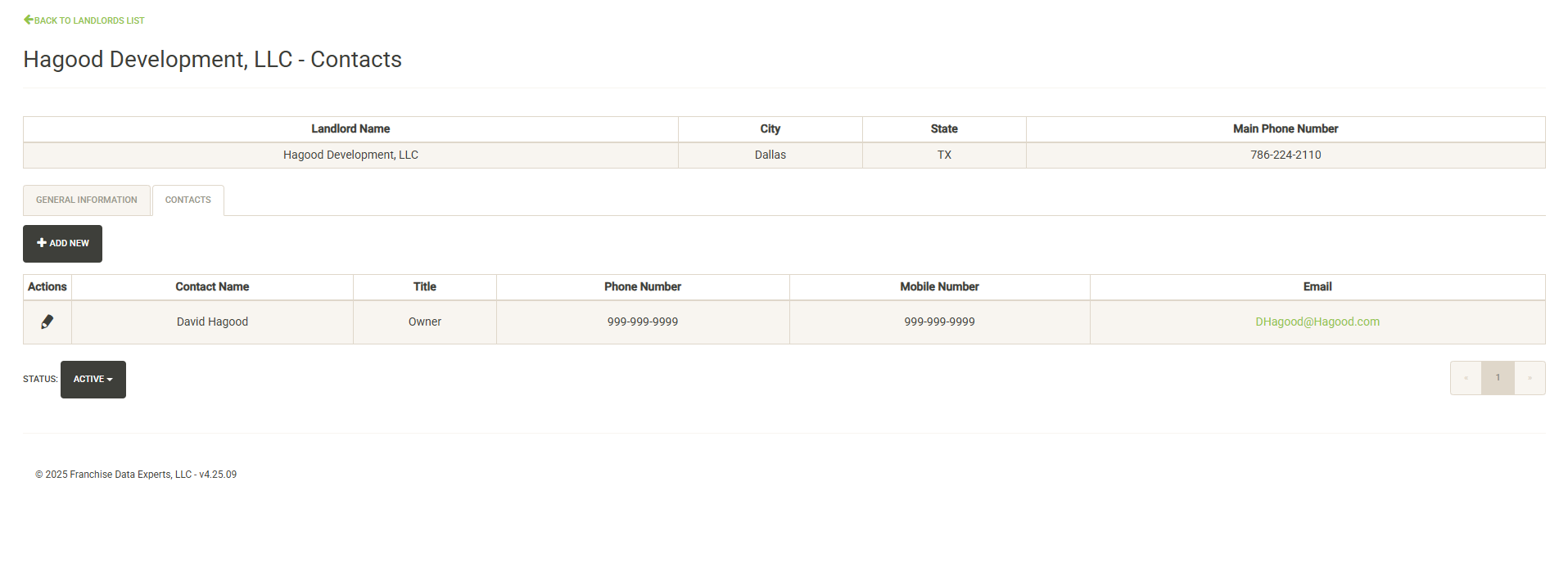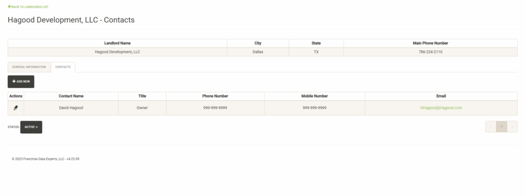Displays contacts for the selected Landlord. You can click on the pencil icon to the left of the contact name to edit the contact information or set it inactive. Click on Add New to add a new contact. Click on the Status dropdown to view active vs. inactive contacts for the Franchise Family.