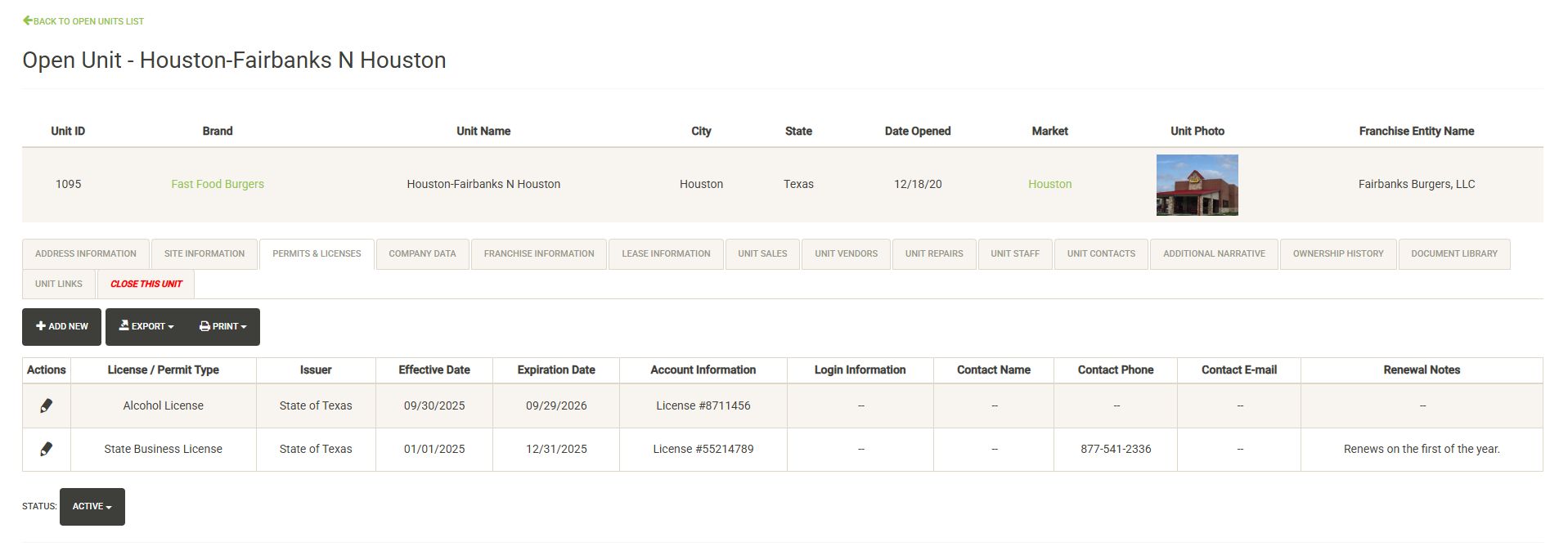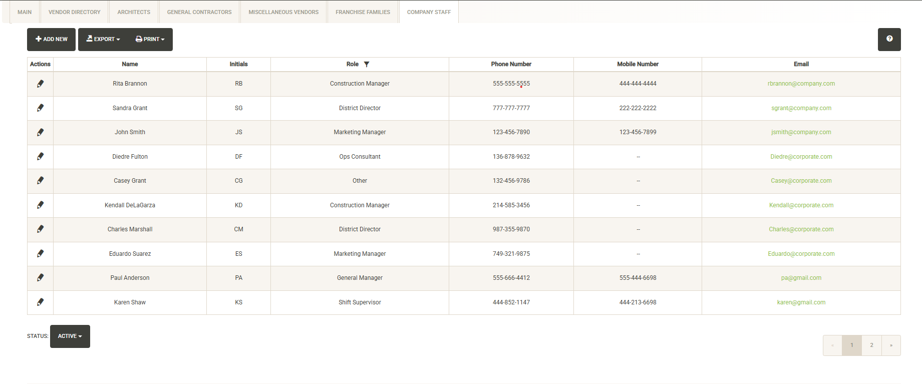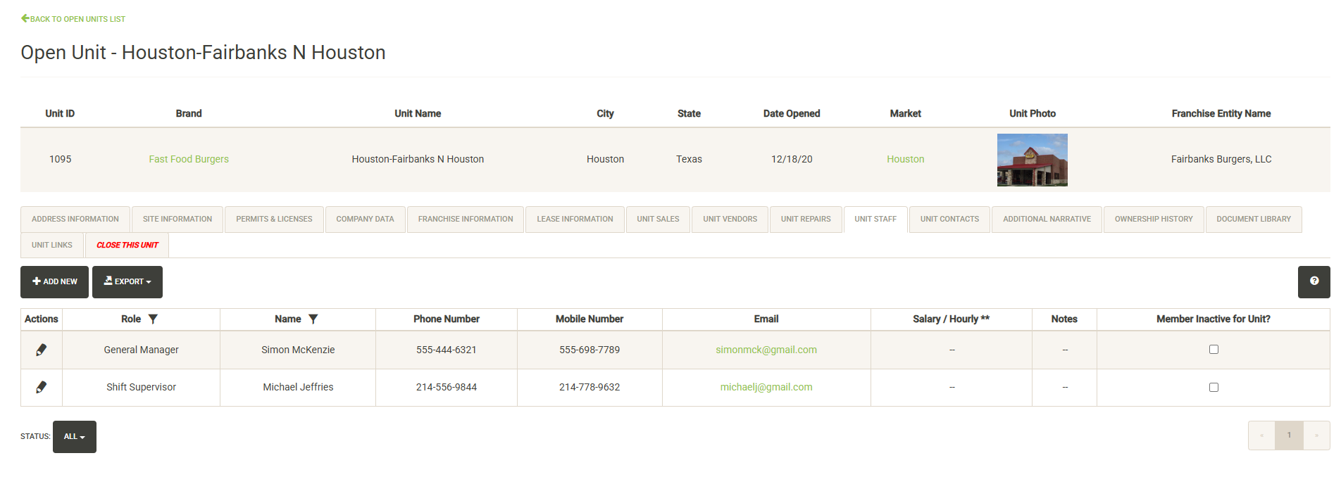 Displays contacts for the selected Landlord. You can click on the pencil icon to the left of the contact name to edit the contact information or set it inactive. Click on Add New to add a new contact. Click on the Status dropdown to view active vs. inactive contacts for the Franchise Family.