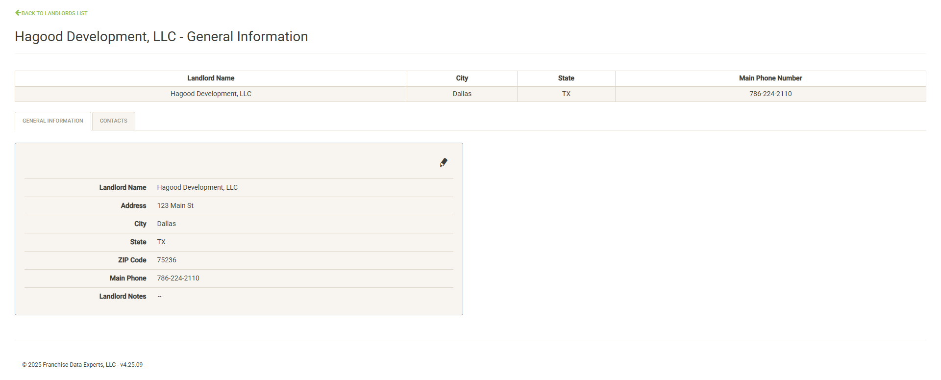 Displays basic information about the Landlord including address, phone and notes. Click on the pencil icon to edit values here (with the proper permissions).