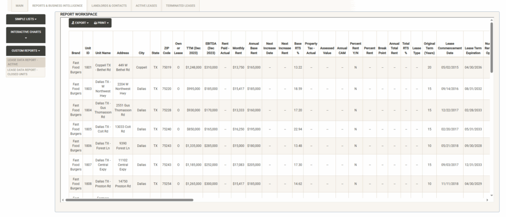 Displays the active leases currently in your system along with key attributes about each lease. You can sort and filter on these columns to customize the list, which can also be exported or printed directly from this screen.