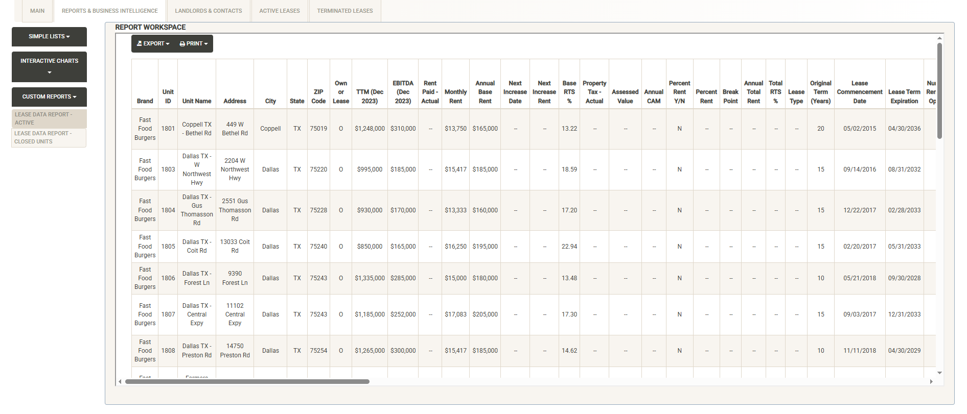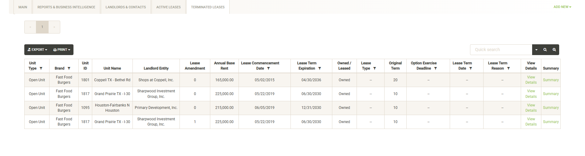 Displays the terminated leases currently in your system along with key attributes about each lease. You can sort and filter on these columns to customize the list, which can also be exported or printed directly from this screen.