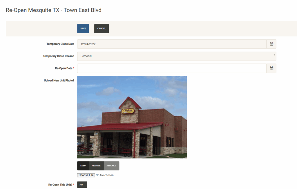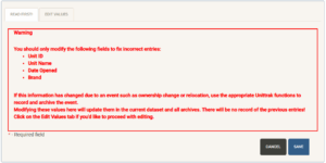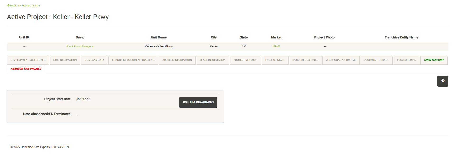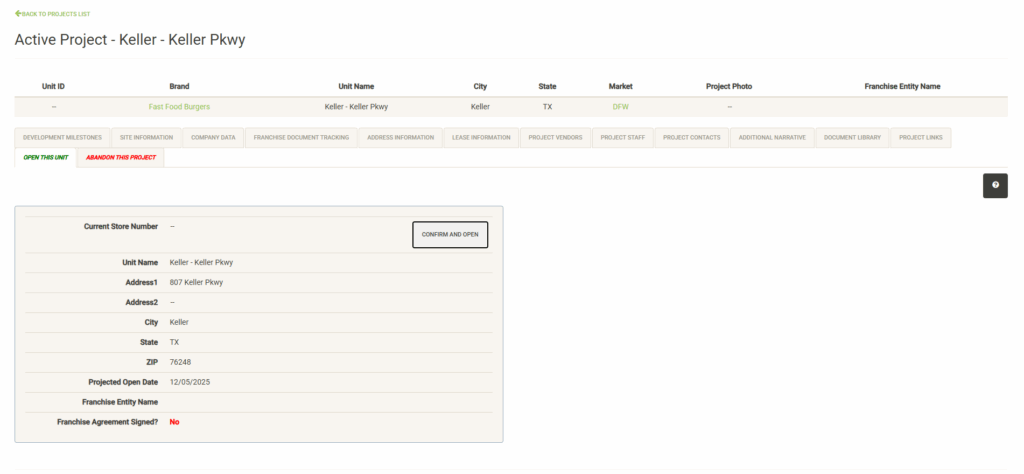 Once your project is complete and ready for opening, use this tab to log the opening and transfer the project to the open units list.