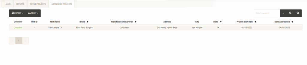 The active projects tab allows you to navigate your full list of active projects. You can use the sort and filter options in the column headers to customize the list. You can also print or export the project list from this screen. Once you’ve located your project, you can quickly access the project’s overview report by clicking on the “Overview” link next to the Unit ID. To access or edit the project details, click on the “View Details” link to the far right of the project information. See the Project Details section for more information about the various options within Project Details.
