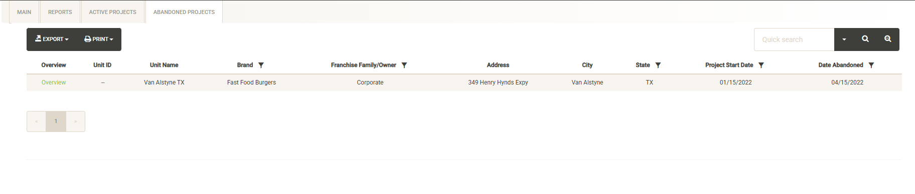 If a project was abandoned before completion, you can find information about it here. Note these abandoned projects are not editable. You can click on the Overview link to view the Overview Report for the abandoned project.