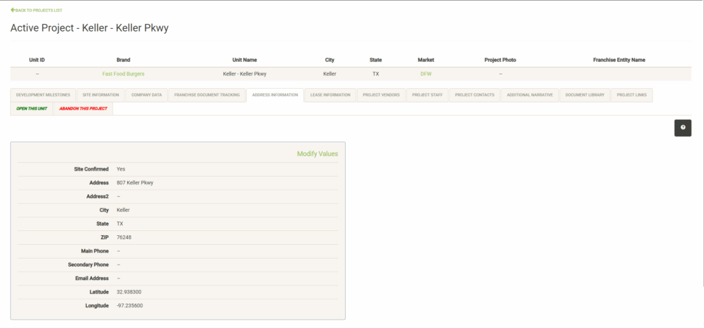 Displays Address information for the project. Address information is not required to start a new project and can be added after project start by clicking Modify Values. Address information can only be entered once the Site Confirmed status is set to “Yes.”