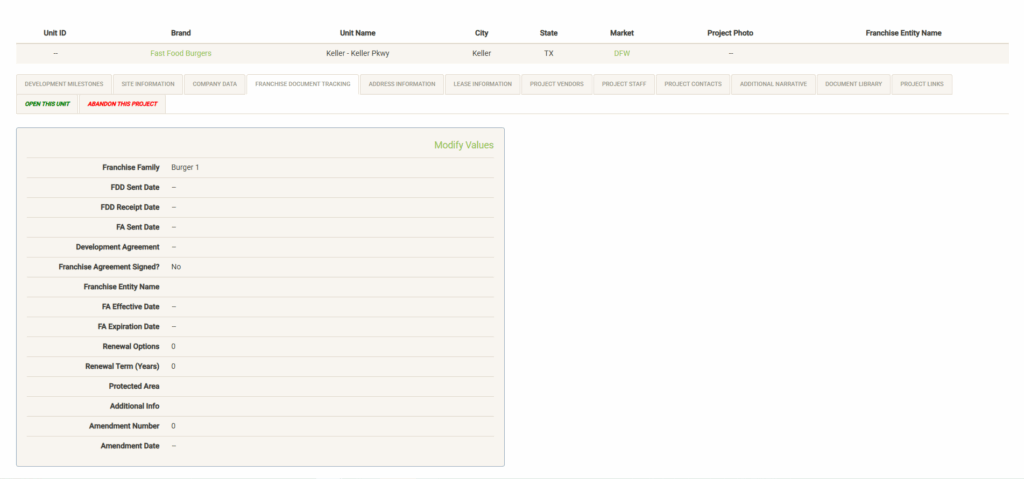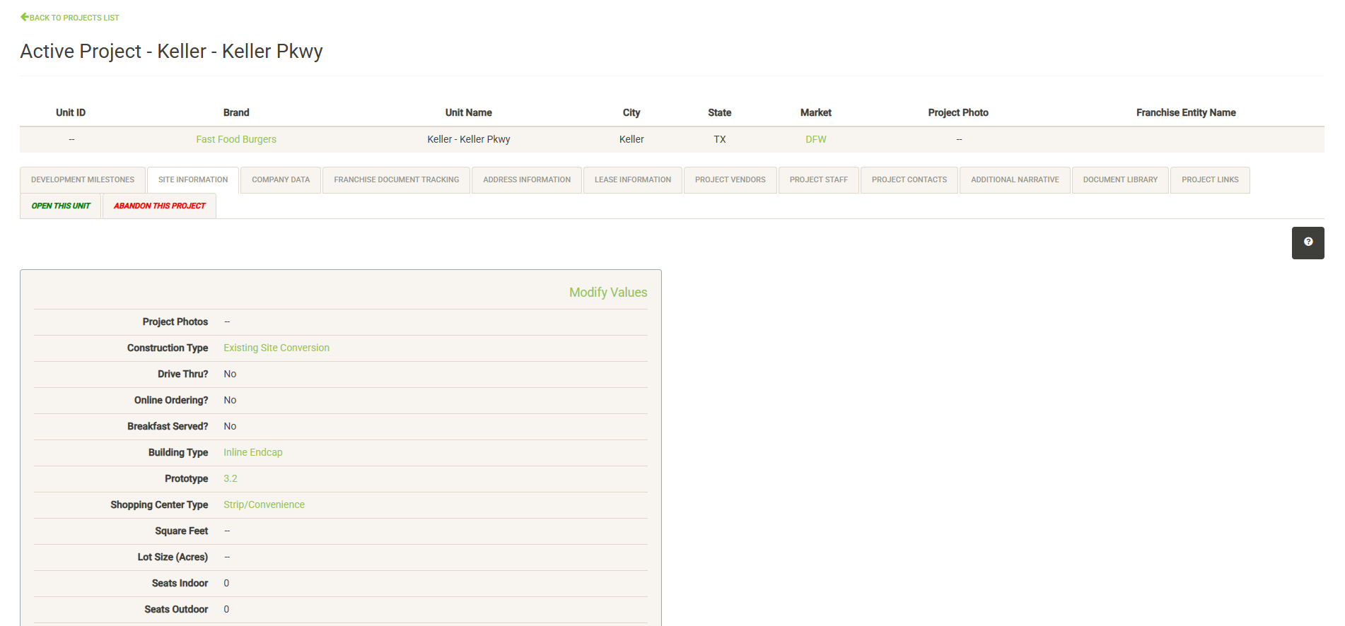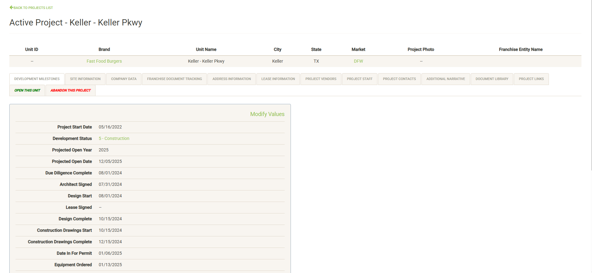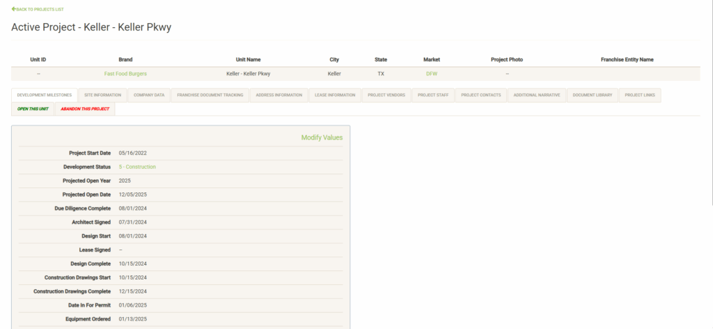 Displays your list of development milestones (created during setup) along with information and dates logged for the project. Click on “Modify Values” (only visible with proper permissions) to update the information on this page. Note that this page displays the same information as the Project Milestones widget from the main Projects page.