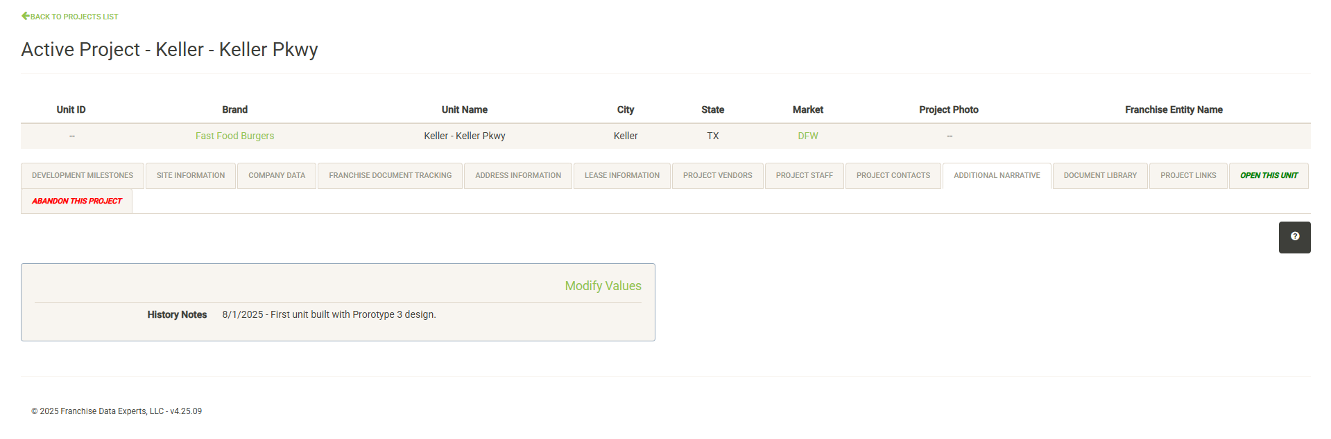 This section displays ongoing notes about the project. Click on Modify Values to add or edit notes. These notes will continue to follow the project through development and will be passed to the open unit once the project has been opened.