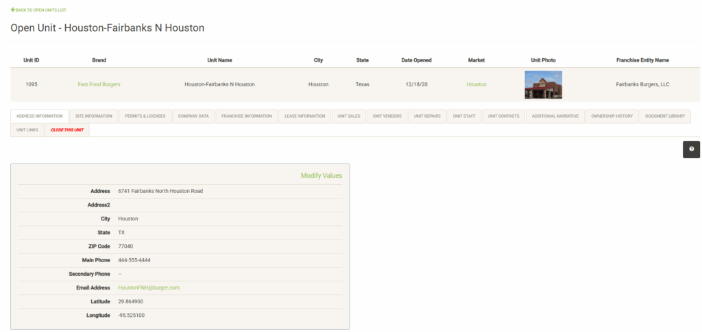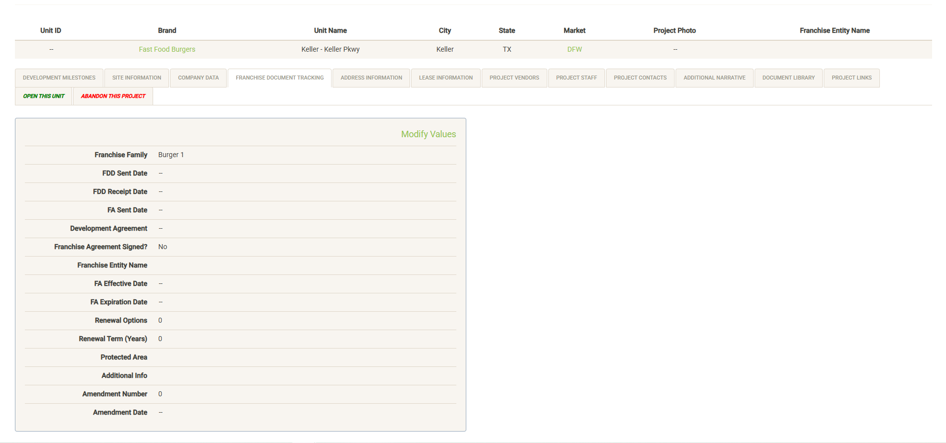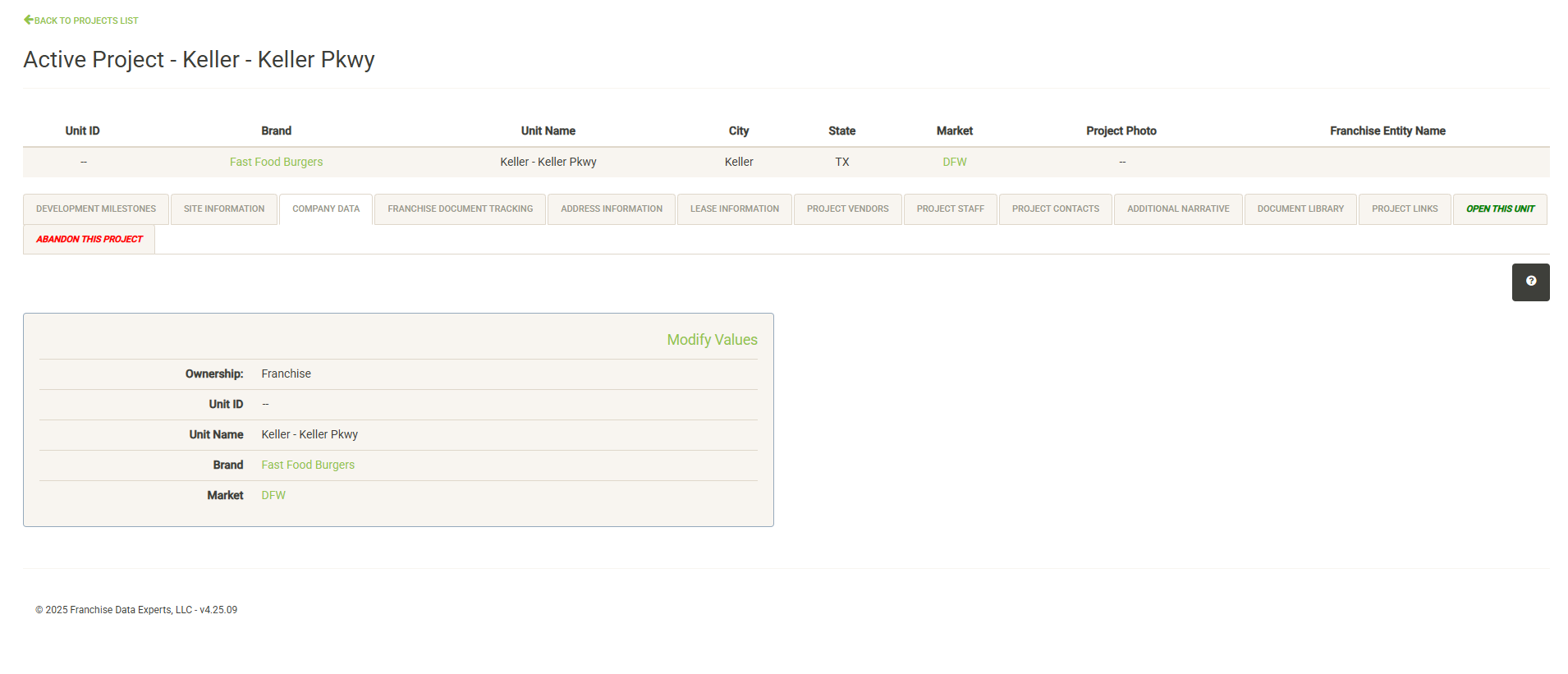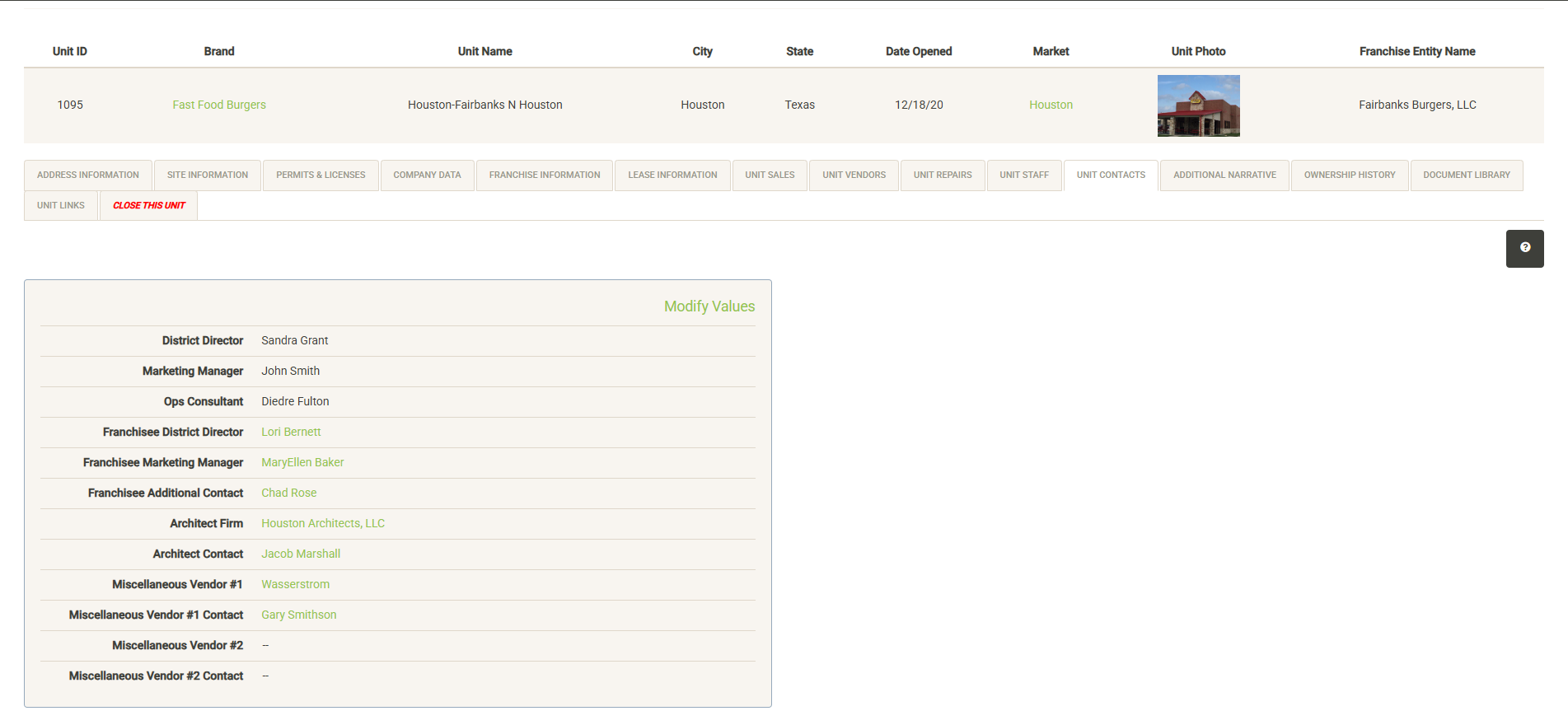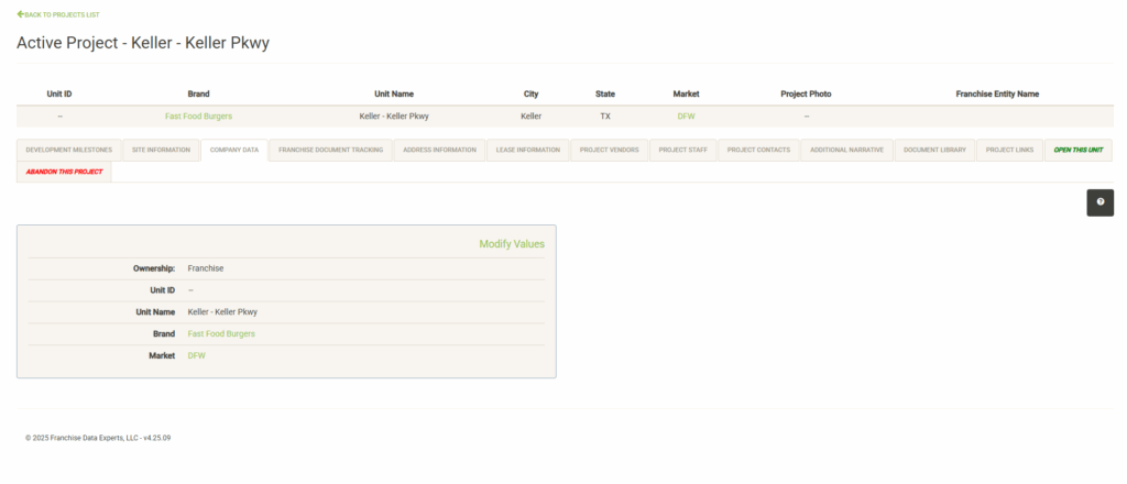 Click “Modify Values” (only visible with proper permissions) to update the information on this page.