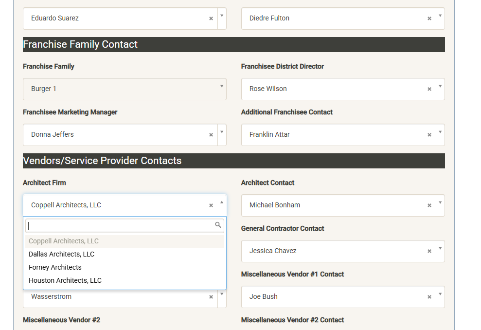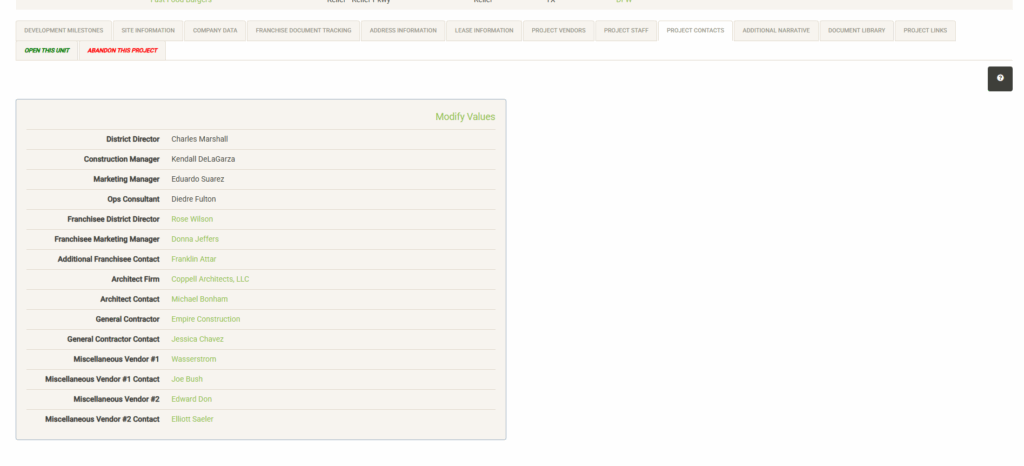 Displays contacts assigned to specific project roles in each project (these roles are customized during setup). Click on Modify Values to add or edit project contacts. Note that staff and outside contacts must first be added to the Contacts module in order to be available for selection here. When selecting internal staff, selections are filtered by role. Franchise Family Contacts are filtered by the assigned Franchise Family, while vendor contacts are filtered by the selected vendor.