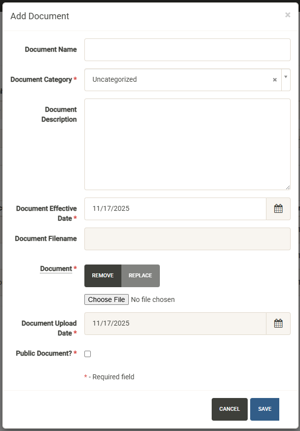 To add a new document, click the Add New button. The Add Document form allows you to add a document name, category, description and effective date. Click Choose File to select your document. Finally, decide if the document will be public or private with the Public Document checkbox.