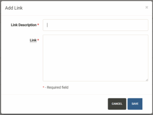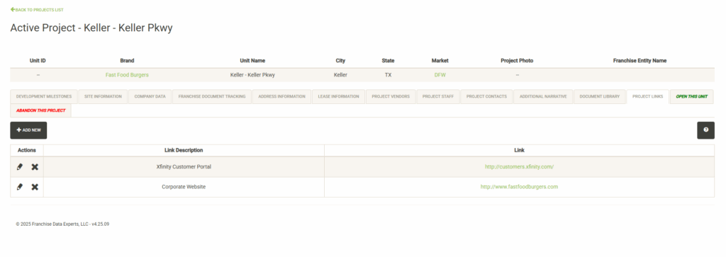 Displays URL’s associated with the project including vendor URL’s and company URL’s. If you have a web link for online bill payment or support services, it can be added here. To access a link, simply click on the URL to open it in a new window. To add a new link, click on the Add New button.