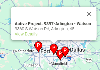 The map is a fully featured Google map displaying Active Projects by brand. You can use the various controls to change the map type, zoom in or out, pan the view, make the map full-screen or enter Streetview mode.