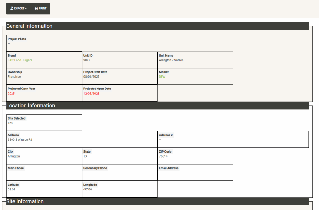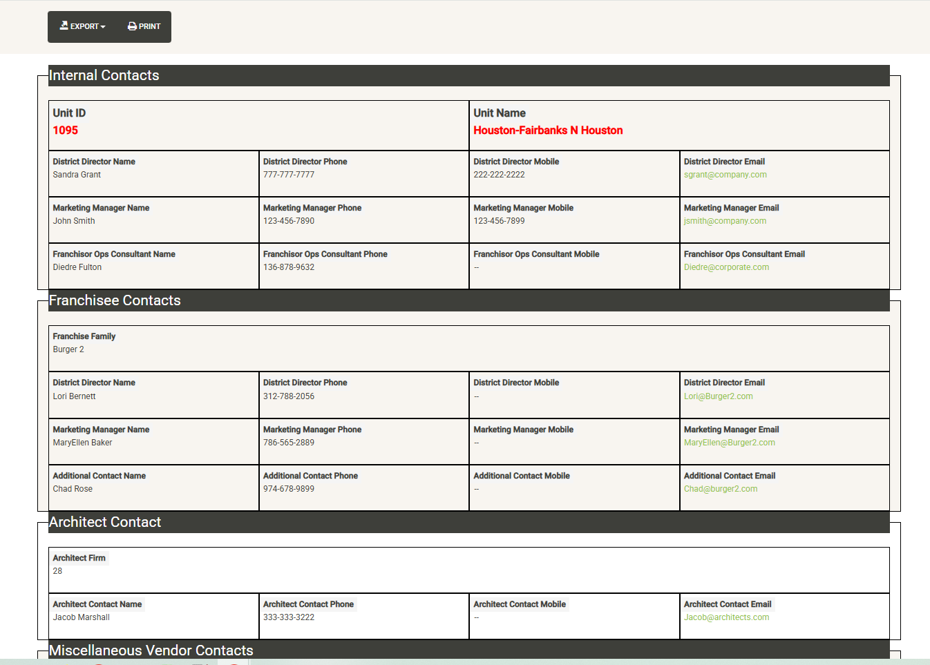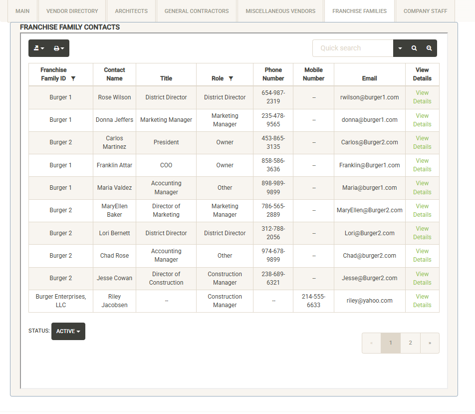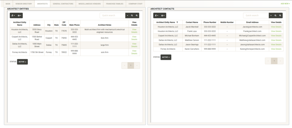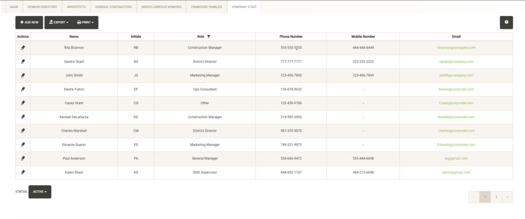 Provides a list of all system contacts that have been loaded into Architects, General Contractors, Miscellaneous Vendors, Franchise Families and Company Staff. The list can be quickly searched, sorted and filtered. Once you have modified the list, you can print or export. If you just need to look up a contact for quick reference, Active Contacts makes the task simple.