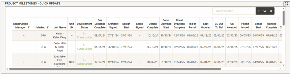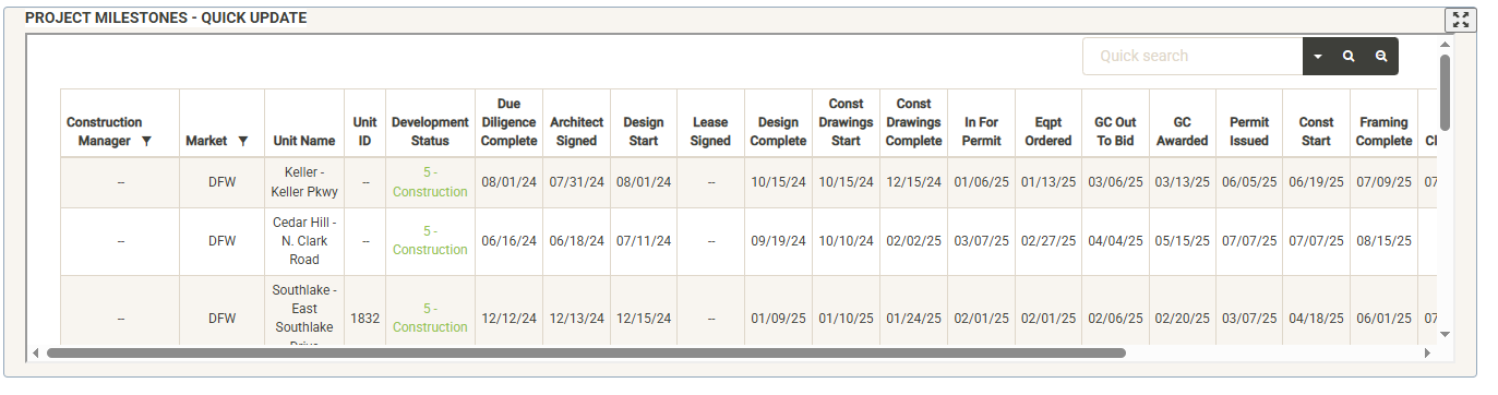 The Project Milestones Widget allows you to quickly update the status of your active projects from the main page. You can expand the widget using the expand button in the upper right corner of the widget. Click the button again to restore the widget to original size. Using the same sort and filter tools as the Active Projects widget you can sort and filter the list or use the search bar to search for your project. Once you’ve located your project, simply hover over the editable fields (development status, milestone dates). An edit pencil will appear in the editable fields (if you have proper permissions). Click on the pencil to edit the value of the field: