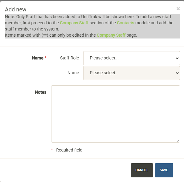 Select the Staff Role from the dropdown, followed by the member name. You can then add unit/project-specific notes for the member.