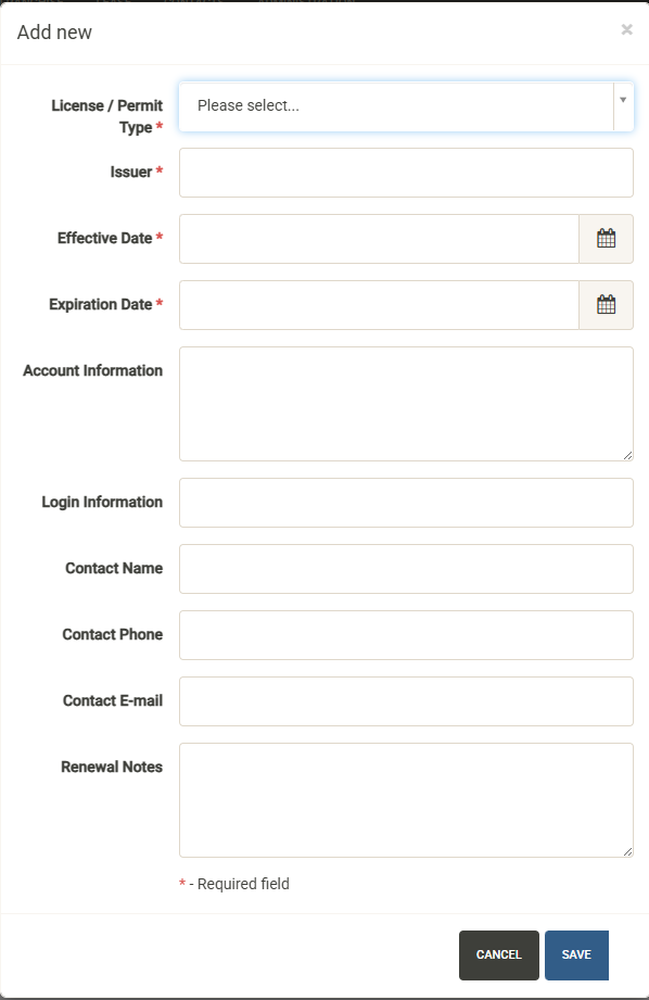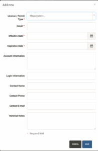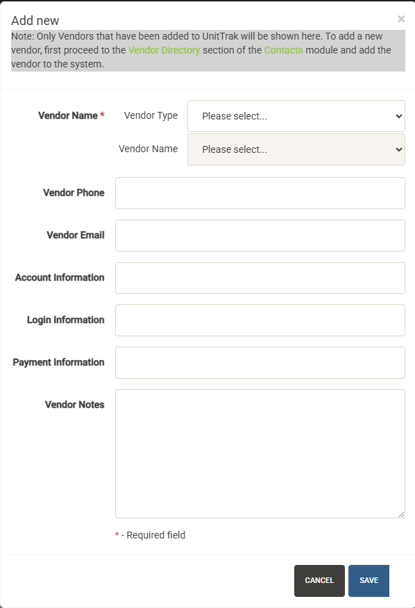 Select the Vendor Type from the dropdown, followed by the vendor name. You can then add unit/project-specific information for the vendor including phone number, email, account information, login information and payment information along with unit-specific notes.