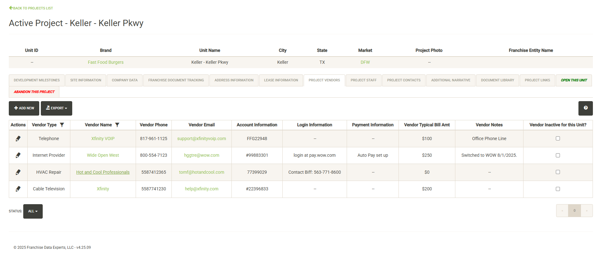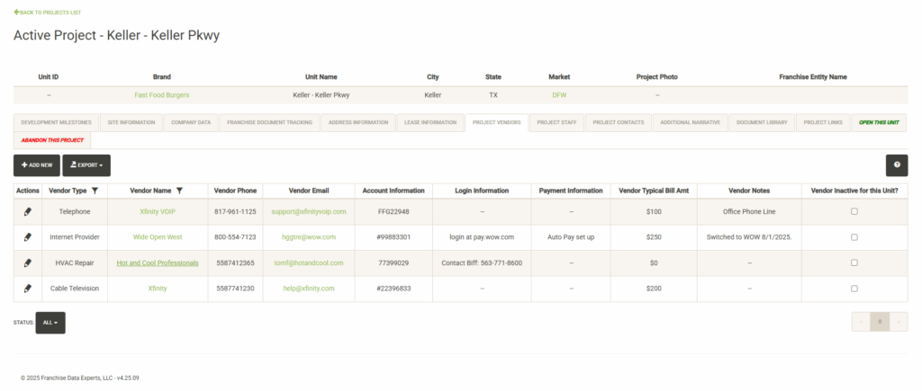 You can edit any of the unit/project specific data here or you can set the vendor to be inactive (with the proper permissions).