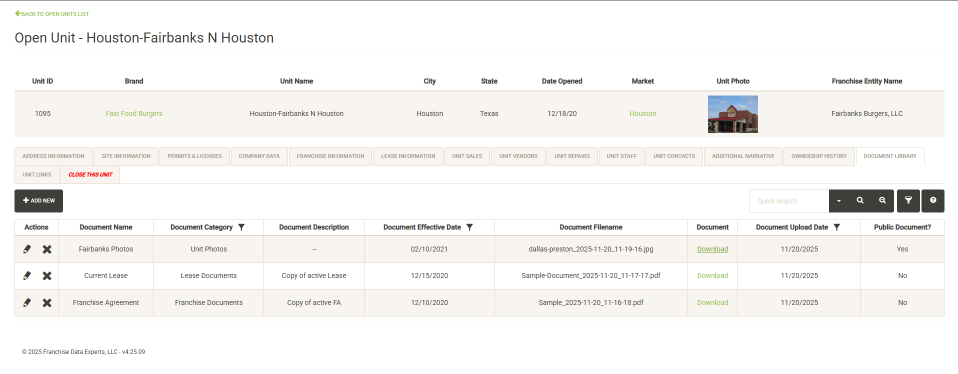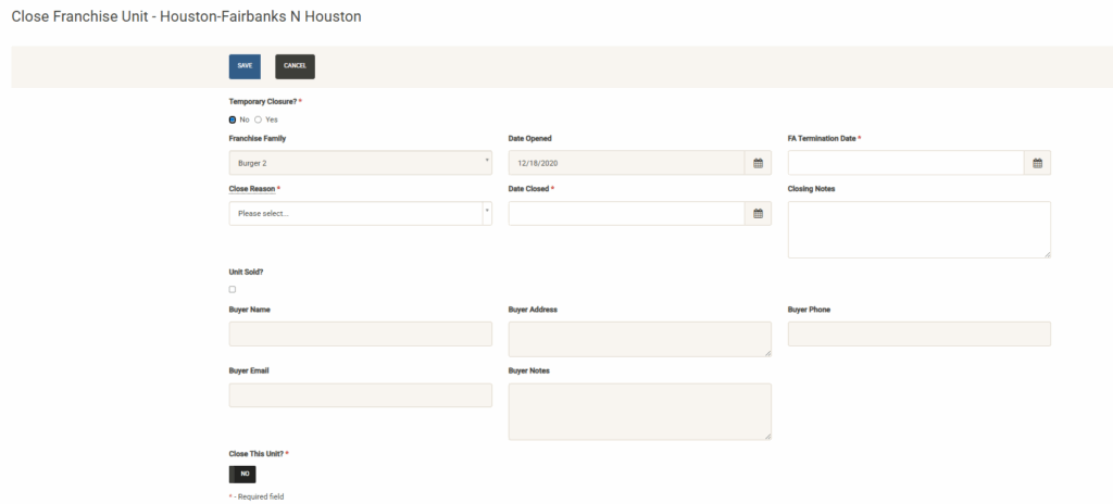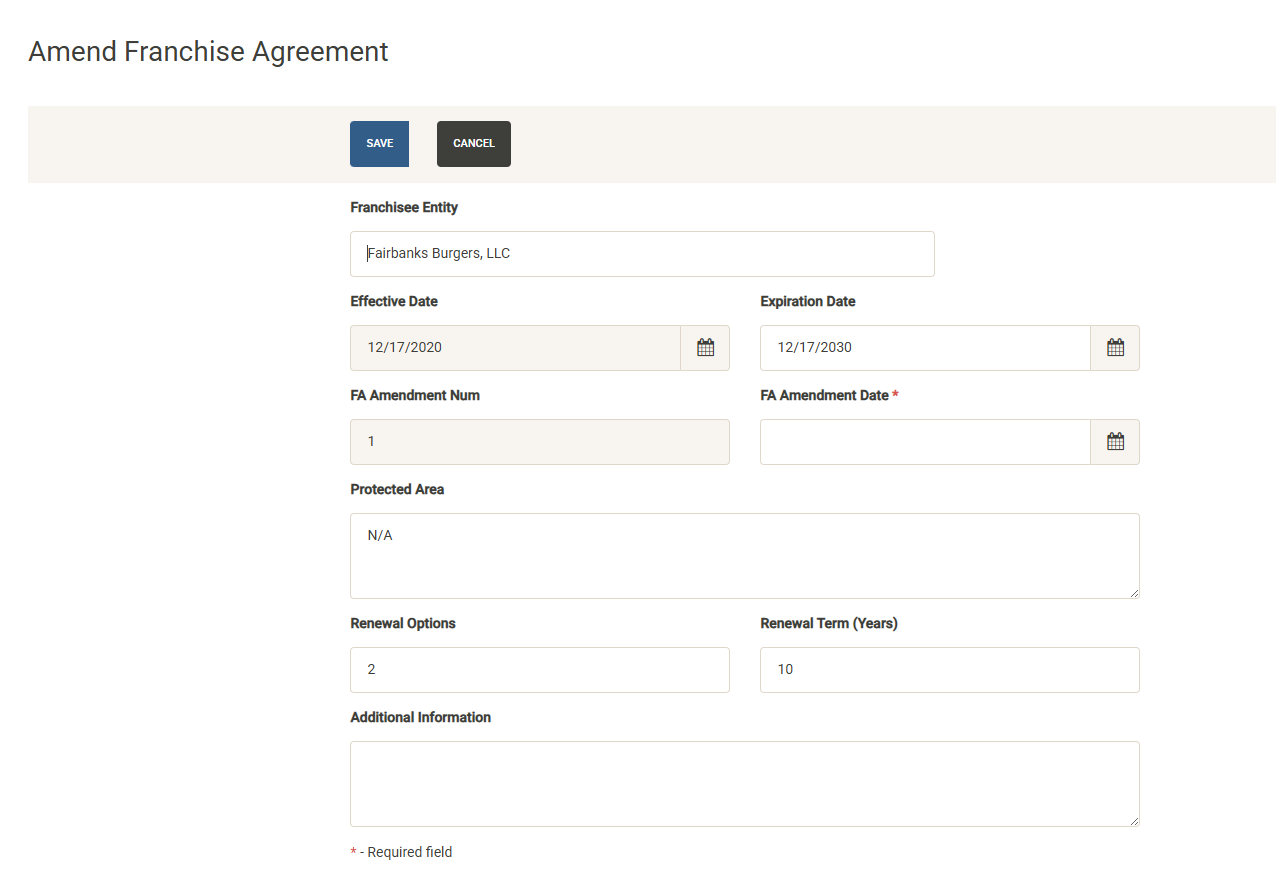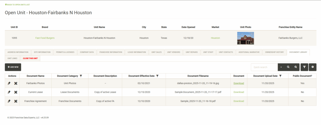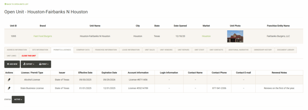 - Franchise – Manage all of your franchise details here including agreement details and renewal dates.