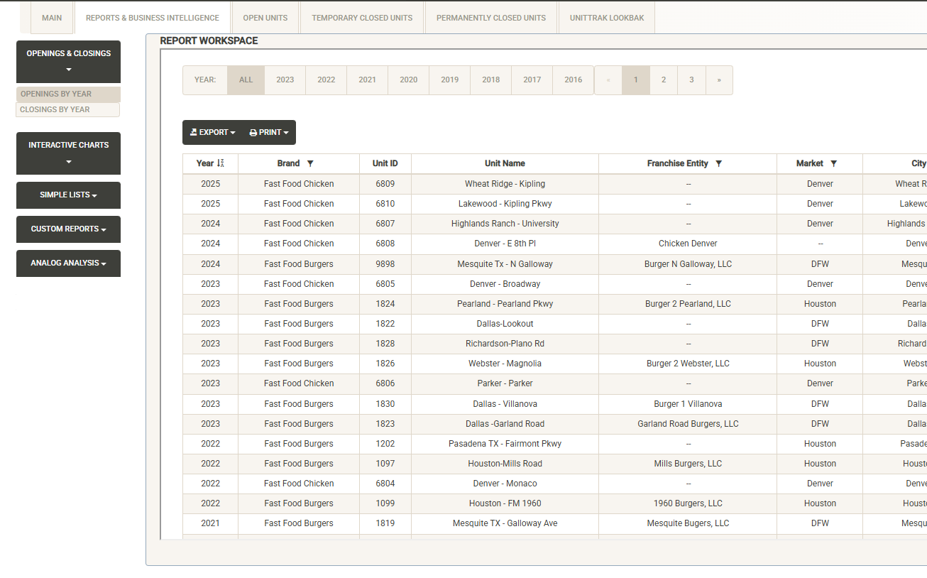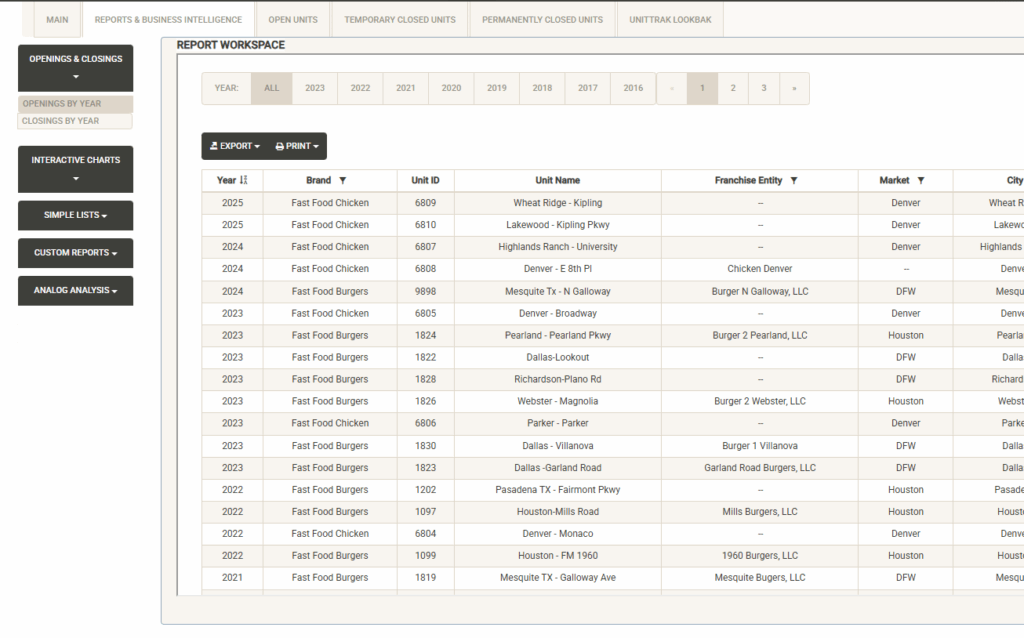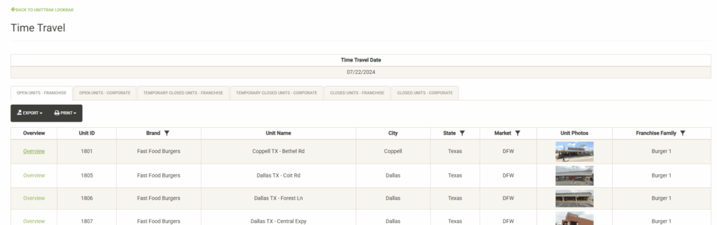 Displays the full list of the Franchise Families in your system. You can use the sort and filter options in the column headers to customize the list. You can also print or export the unit list from this screen.