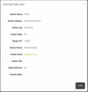 The Vendor Directory displays a list of vendors that have been registered in UnitTrak. These vendors can be assigned to units and projects through the unit details and project details pages. The Vendor Directory contains contact information for the vendor including phone number and e-mail addresses. When assigning a vendor to a unit or project, unit-specific contact information can also be added. You can view the unit-specific details on the Assigned Units or Assigned Projects tabs.