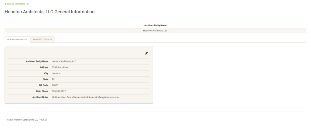 If you clicked on the entity details, you will be taken to the general information page. If you have the proper permissions, you can click the edit pencil to modify this information or set the Architect inactive.