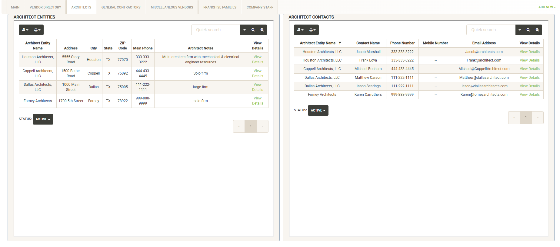 Each of these pages is similar, displaying a list of Entities on the left and a full contact list for the category on the right. You can search either of these sections, sort and filter, and print or export the lists. You can click on the Status drop-down to switch between active and inactive entries. Clicking on View Details for either an entity or contact takes you to the detail page.