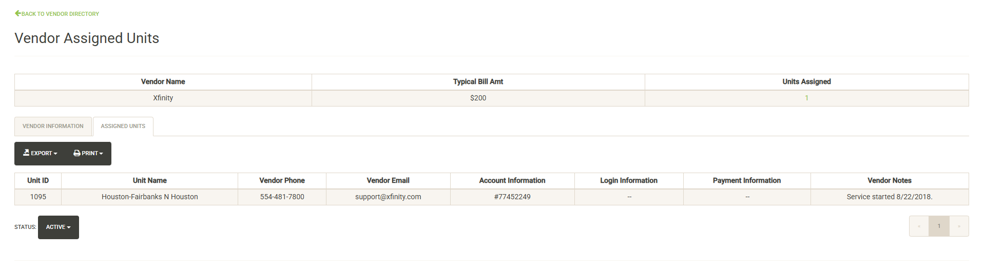 Click on the Status dropdown to view inactive assignments. If a vendor was assigned to a unit and then later the assignment was set inactive, you can view that history here.