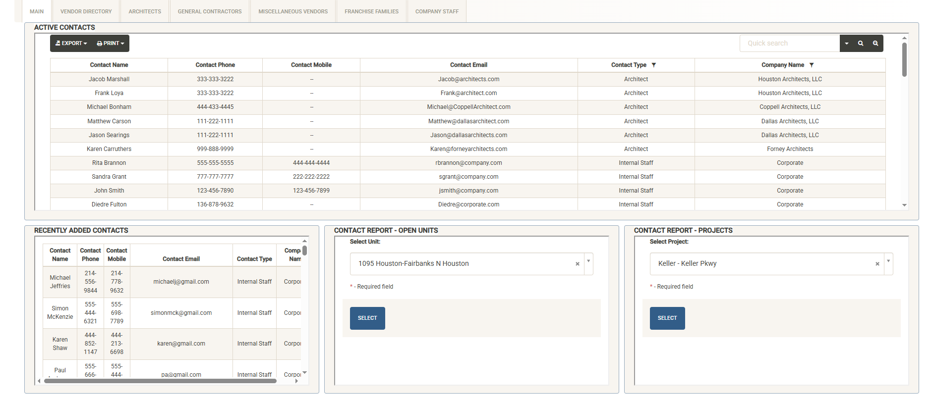 To generate a complete contact report for a unit or project, simply select the unit or project from the drop down and hit Select. The report can be printed or exported from this page.