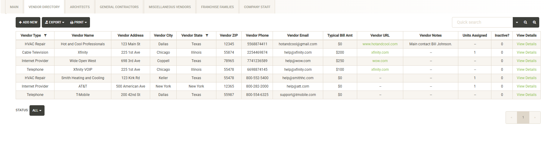 Also included is a field for optionally including a Typical Bill Amount, URL, Notes, and the number units (including projects) that the vendor has been assigned to. Click on the Status dropdown to view Active/Inactive vendors. Note that Inactive Vendors will not be available for assignment to units or projects.
