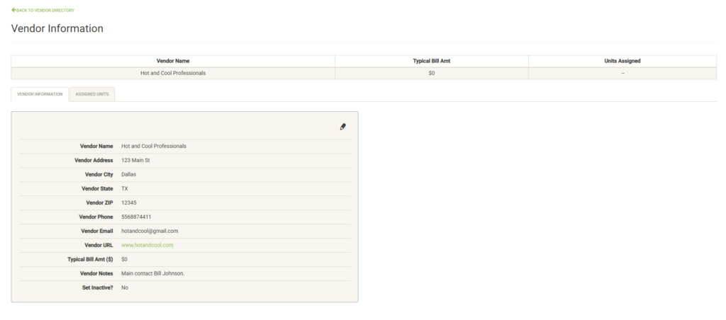 Note that the vendor must first be added to the vendor directory before it can be assigned to a unit or project. You can follow the link in the instructions to add the vendor to the directory if needed.