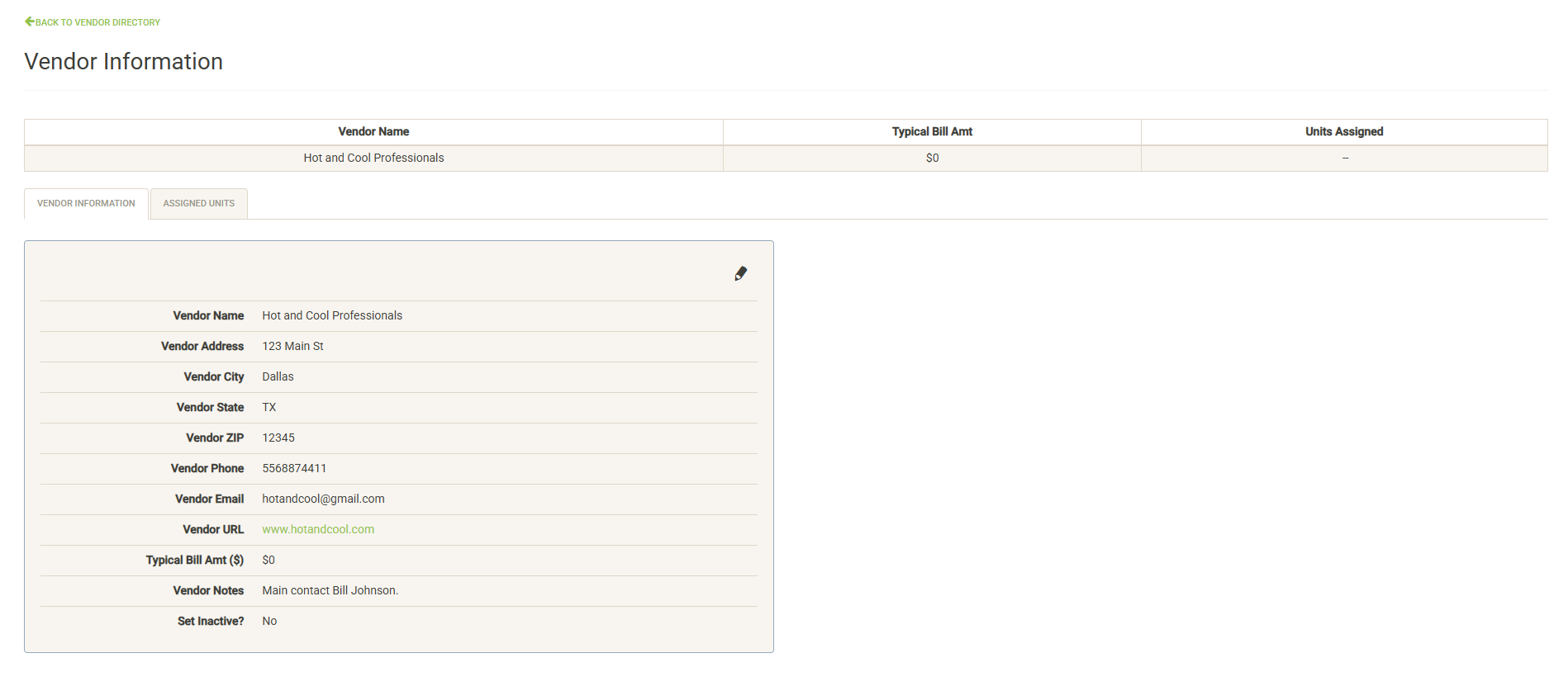 Displays general and contact information for the vendor. Note this is the main contact information, units and projects that have assigned this vendor can include unit-specific contact information. You can view this information in the Assigned Units or Assigned Projects tabs.